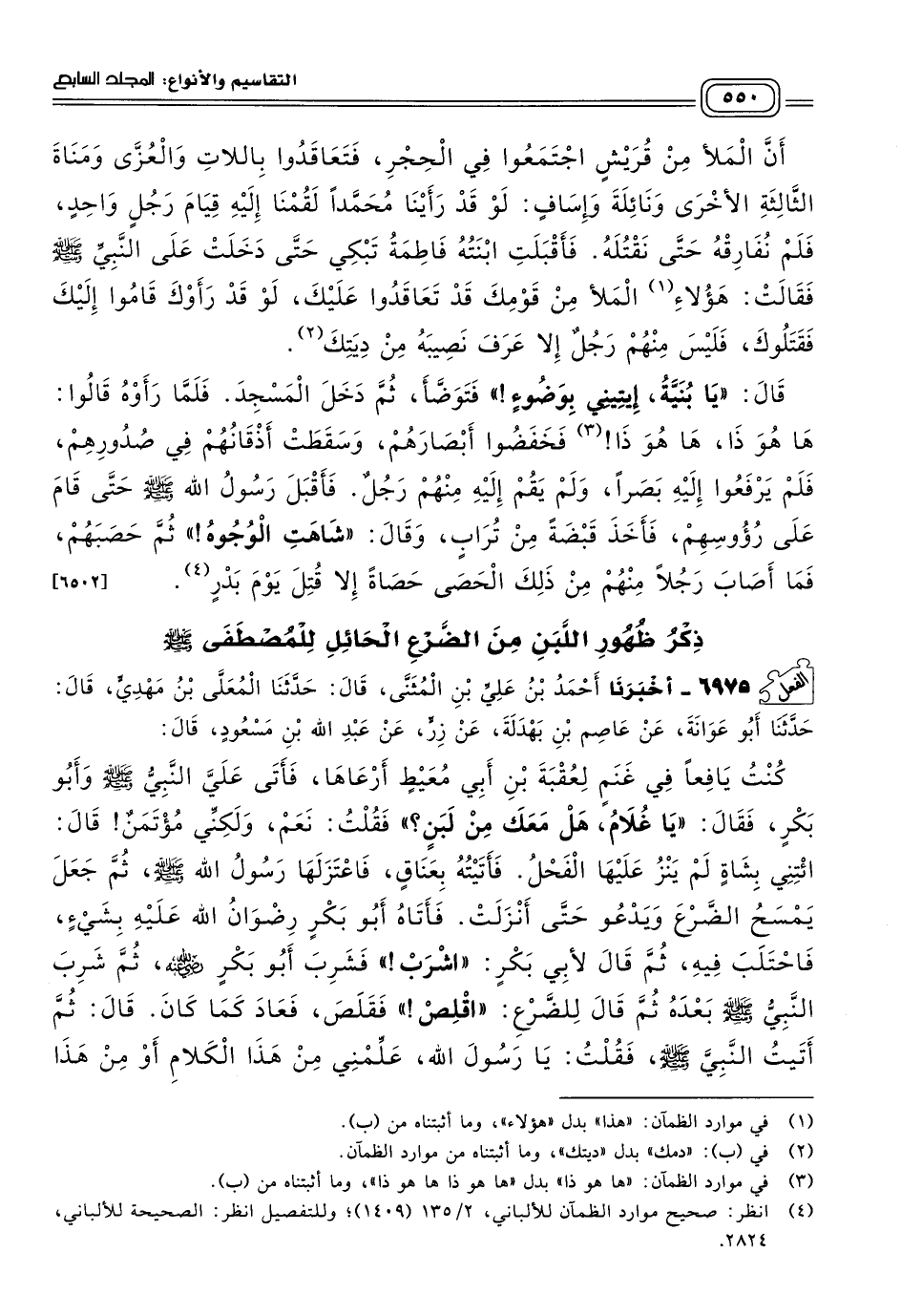 ٦٩٧٥ - أَخبَرنا أَحْمَدُ بْنُ عَلِيِّ بْنِ الْمُثَنَّى، قَالَ: حَدثنا الْمُعَلَّى بْنُ مَهْدِيٍّ، قَالَ: حَدثنا أَبُو عَوَانَةَ، عَنْ عَاصِمِ ابْنِ بَهْدَلَةَ، عَنْ زِرٍّ، عَنْ عَبْدِ اللهِ بْنِ مَسْعُودٍ، قَالَ: كُنْتُ يَافِعًا فِي غَنَمٍ لِعُقْبَةَ بْنِ أَبِي مُعَيْطٍ أَرْعَاهَا، فَأَتَى عَلَيَّ النَّبِيُّ صَلى الله عَلَيه وسَلم وَأَبُو بَكْرٍ، فَقَالَ: "يَا غُلَامُ، هَلْ مَعَكَ مِنْ لَبَنٍ؟ " فَقُلْتُ: نَعَمْ، وَلَكِنِّي مُؤْتَمَنٌ، قَالَ: ائْتِنِي بِشَاةٍ لَمْ يَنْزُ عَلَيْهَا الْفَحْلُ، فَأَتَيْتُهُ بِعَنَاقٍ، فَاعْتَزَلَهَا رَسُولُ اللهِ صَلى الله عَلَيه وسَلم، ثُمَّ جَعَلَ يَمْسَحُ الضَّرْعَ وَيَدْعُو حَتَّى أَنْزَلَتْ، فَأَتَاهُ أَبُو بَكْرٍ رِضْوَانُ اللهِ عَلَيْهِ بِشَيْءٍ، فَاحْتَلَبَ فِيهِ، ثُمَّ قَالَ لأَبِي بَكْرٍ: "اشْرَبْ"، فَشَرِبَ أَبُو بَكْرٍ رَضِيَ اللهُ عَنْهُ، ثُمَّ شَرِبَ النَّبِيُّ صَلى الله عَلَيه وسَلم بَعْدَهُ، ثُمَّ قَالَ لِلضَّرْعِ: "اقْلِصْ"، فَقَلَصَ، فَعَادَ كَمَا كَانَ، قَالَ: ثُمَّ أَتَيْتُ النَّبِيَّ صَلى الله عَلَيه وسَلم: فَقُلْتُ: يَا رَسُولَ اللهِ، عَلِّمْنِي مِنْ هَذَا الْكَلَامِ، أَوْ مِنْ هَذَا الْقُرْآنِ، فَمَسَحَ رَأْسِي، وَقَالَ صَلى الله عَلَيه وسَلم: "إِنَّكَ غُلَامٌ مُعَلَّمٌ"، قَالَ: فَلَقَدْ أَخَذْتُ مِنْ فِيهِ سَبْعِينَ سُورَةً، مَا نَازَعَنِي فِيهَا بَشَرٌ. [٦٥٠٤]