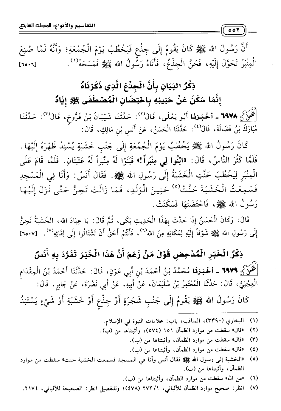 ٦٩٧٩ - أَخبَرنا مُحَمَّدُ بْنُ أَحْمَدَ بْنِ أَبِي عَوْنٍ، قَالَ: حَدثنا أَحْمَدُ بْنُ الْمِقْدَامِ الْعِجْلِيُّ، قَالَ: حَدثنا الْمُعْتَمِرُ بْنُ سُلَيْمَانَ، عَنْ أَبِيهِ، عَنْ أَبِي نَضْرَةَ، عَنْ جَابِرٍ، قَالَ: كَانَ رَسُولُ اللهِ صَلى الله عَلَيه وسَلم يَقُومُ إِلَى جَنْبِ شَجَرَةٍ، أَوْ جِذْعٍ، أَوْ خَشَبَةٍ، أَوْ شَيْءٍ يَسْتَنِدُ إِلَيْهِ يَخْطُبُ، ثُمَّ اتَّخَذَ مِنْبَرًا، فَكَانَ يَقُومُ عَلَيْهِ، فَحَنَّتْ تِلْكَ الَّتِي كَانَ يَقُومُ عِنْدَهَا حَنِينًا سَمِعَهُ أَهْلُ الْمَسْجِدِ، فَأَتَاهَا رَسُولُ اللهِ صَلى الله عَلَيه وسَلم، فَإِمَّا قَالَ: مَسَحَهَا، وَإِمَّا قَالَ: فَأَمْسَكَهَا، فَسَكَنَتْ. [٦٥٠٨]