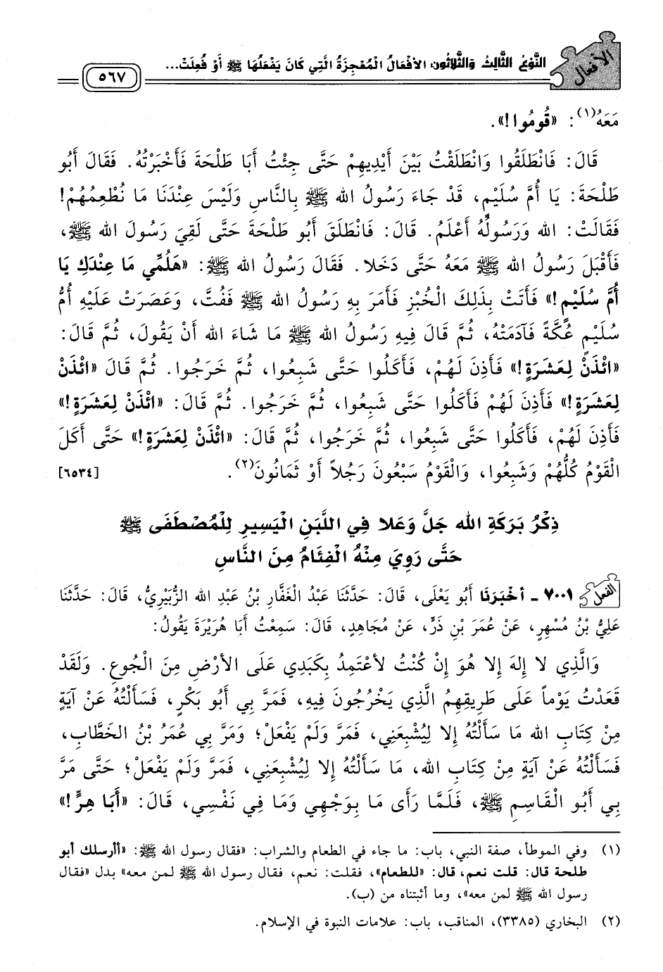 قَالَ: فَانْطَلَقُوا وَانْطَلَقْتُ بَيْنَ أَيْدِيهِمْ حَتَّى جِئْتُ أَبَا طَلْحَةَ، فَأَخْبَرْتُهُ، فَقَالَ أَبُو طَلْحَةَ: يَا أُمَّ سُلَيْمٍ، قَدْ جَاءَ رَسُولُ اللهِ صَلى الله عَلَيه وسَلم بِالنَّاسِ، وَلَيْسَ عِنْدَنَا مَا نُطْعِمُهُمْ، فَقَالَتْ: اللهُ وَرَسُولُهُ أَعْلَمُ، قَالَ: فَانْطَلَقَ أَبُو طَلْحَةَ حَتَّى لَقِيَ رَسُولَ اللهِ صَلى الله عَلَيه وسَلم، فَأَقْبَلَ رَسُولُ اللهِ صَلى الله عَلَيه وسَلم مَعَهُ حَتَّى دَخَلَا، فَقَالَ رَسُولُ اللهِ صَلى الله عَلَيه وسَلم: "هَلُمِّي مَا عِنْدَكِ يَا أُمَّ سُلَيْمٍ"، فَأَتَتْ بِذَلِكَ الْخُبْزِ، فَأَمَرَ بِهِ رَسُولُ اللهِ صَلى الله عَلَيه وسَلم فَفُتَّ، وَعَصَرَتْ عَلَيْهِ أُمُّ سُلَيْمٍ عُكَّةً فَآدَمَتْهُ، ثُمَّ قَالَ فِيهِ رَسُولُ اللهِ صَلى الله عَلَيه وسَلم مَا شَاءَ اللهُ أَنْ يَقُولَ، ثُمَّ قَالَ: "ائْذَنْ لِعَشَرَةٍ"، فَأَذِنَ لَهُمْ، فَأَكَلُوا حَتَّى شَبِعُوا، ثُمَّ خَرَجُوا، ثُمَّ قَالَ: "ائْذَنْ لِعَشَرَةٍ"، فَأَذِنَ لَهُمْ، فَأَكَلُوا حَتَّى شَبِعُوا، ثُمَّ خَرَجُوا، ثُمَّ قَالَ: "ائْذَنْ لِعَشَرَةٍ"، فَأَذِنَ لَهُمْ، فَأَكَلُوا حَتَّى شَبِعُوا، ثُمَّ خَرَجُوا، ثُمَّ قَالَ: "ائْذَنْ لِعَشَرَةٍ"، حَتَّى أَكَلَ الْقَوْمُ كُلُّهُمْ وَشَبِعُوا، وَالْقَوْمُ سَبْعُونَ رَجُلاً، أَوْ ثَمَانُونَ. [٦٥٣٤]