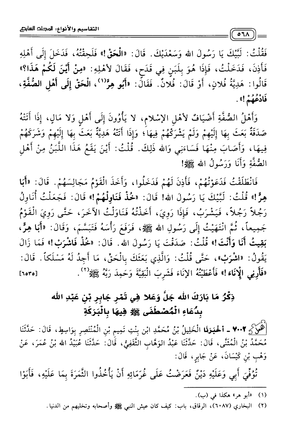 فَقَالَ: "أَبُو هِرٍّ، الْحَقْ إِلَى أَهْلِ الصُّفَّةِ، فَادْعُهُمْ"، وَأَهْلُ الصُّفَّةِ أَضْيَافٌ لأَهْلِ الإِسْلَامِ، لَا يَأْوُونَ إِلَى أَهْلٍ وَلَا مَالٍ، إِذَا أَتَتْهُ صَدَقَةٌ بَعَثَ بِهَا إِلَيْهِمْ، وَلَمْ يَشْرَكْهُمْ فِيهَا، وَإِذَا أَتَتْهُ هَدِيَّةٌ بَعَثَ بِهَا إِلَيْهِمْ وَشَرَكَهُمْ فِيهَا، وَأَصَابَ مِنْهَا، فَسَاءَنِي وَاللهِ ذَلِكَ، قُلْتُ: أَيْنَ يَقَعُ هَذَا اللَّبَنُ مِنْ أَهْلِ الصُّفَّةِ وَأَنَا وَرَسُولُ اللهِ صَلى الله عَلَيه وسَلم!