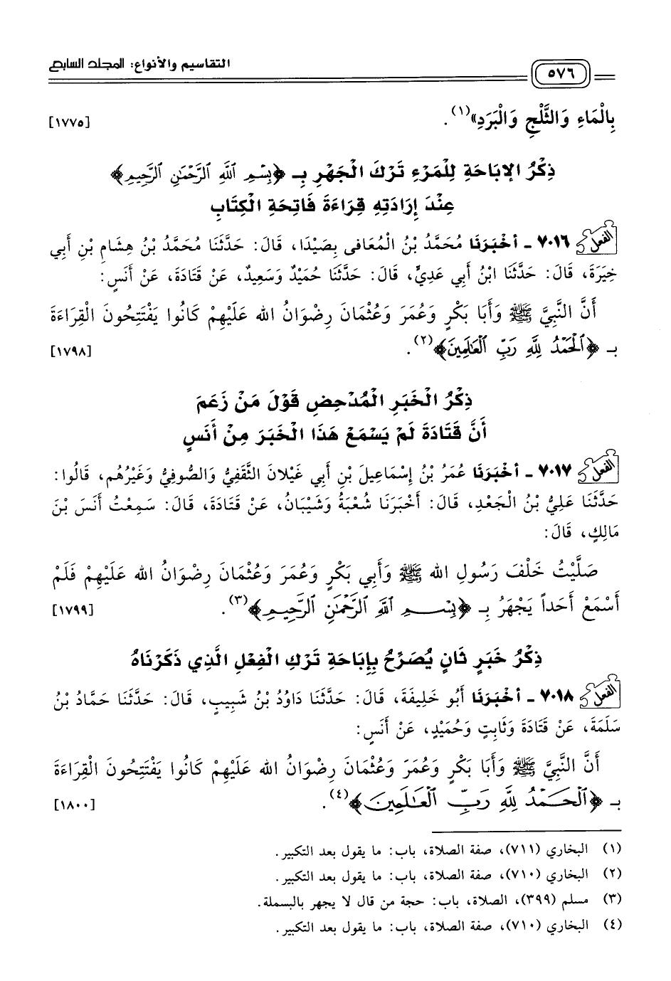 ٧٠١٨ - أَخبَرنا أَبُو خَلِيفَةَ، قَالَ: حَدثنا دَاوُدُ بْنُ شَبِيبٍ، قَالَ: حَدثنا حَمَّادُ بْنُ سَلَمَةَ، عَنْ قَتَادَةَ، وَثَابِتٍ، وَحُمَيْدٍ، عَنْ أَنَسٍ؛ أَنَّ النَّبِيَّ صَلى الله عَلَيه وسَلم وَأَبَا بَكْرٍ وَعُمَرَ وَعُثْمَانَ رِضْوَانُ اللهِ عَلَيْهِمْ، كَانُوا يَفْتَتِحُونَ الْقِرَاءَةَ بِـ {الْحَمْدُ للهِ رَبِّ الْعَالَمِينَ}. [١٨٠٠]