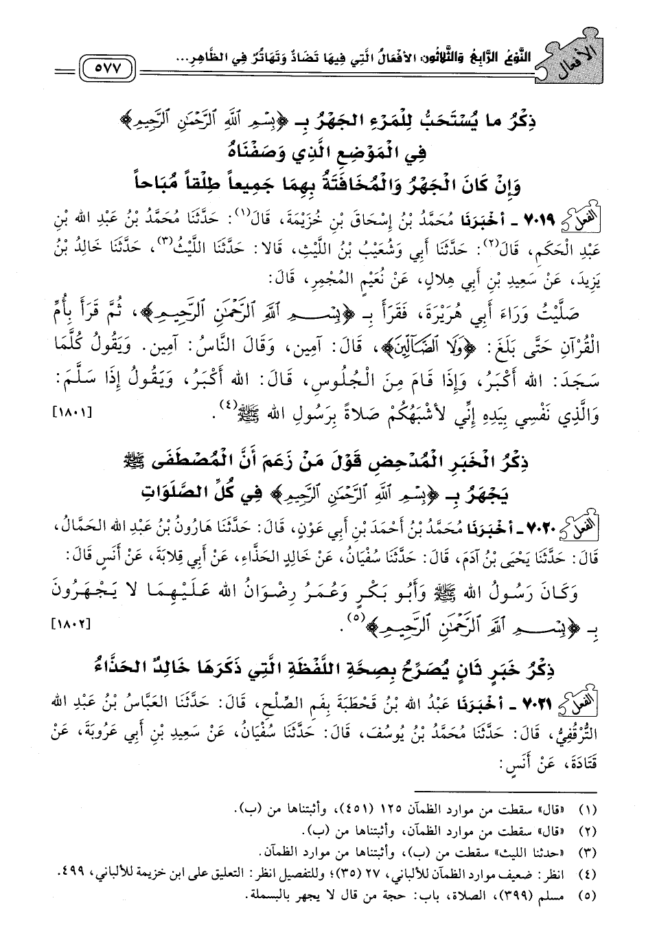 ٧٠٢٠ - أَخبَرنا مُحَمَّدُ بْنُ أَحْمَدَ بْنِ أَبِي عَوْنٍ، قَالَ: حَدثنا هَارُونُ بْنُ عَبْدِ اللهِ الْحَمَّالُ، قَالَ: حَدثنا يَحْيَى بْنُ آدَمَ، قَالَ: حَدثنا سُفْيَانُ، عَنْ خَالِدٍ الْحَذَّاءِ، عَنْ أَبِي قِلَابَةِ، عَنْ أَنَسٍ، قَالَ: وَكَانَ رَسُولِ اللهِ صَلى الله عَلَيه وسَلم وَأَبُو بَكْرٍ وَعُمَرُ رِضْوَانُ اللهِ عَلَيْهِمَا، لَا يَجْهَرُونَ بِـ {بِسْمِ اللهِ الرَّحْمَنِ الرَّحِيمِ}. [١٨٠٢]