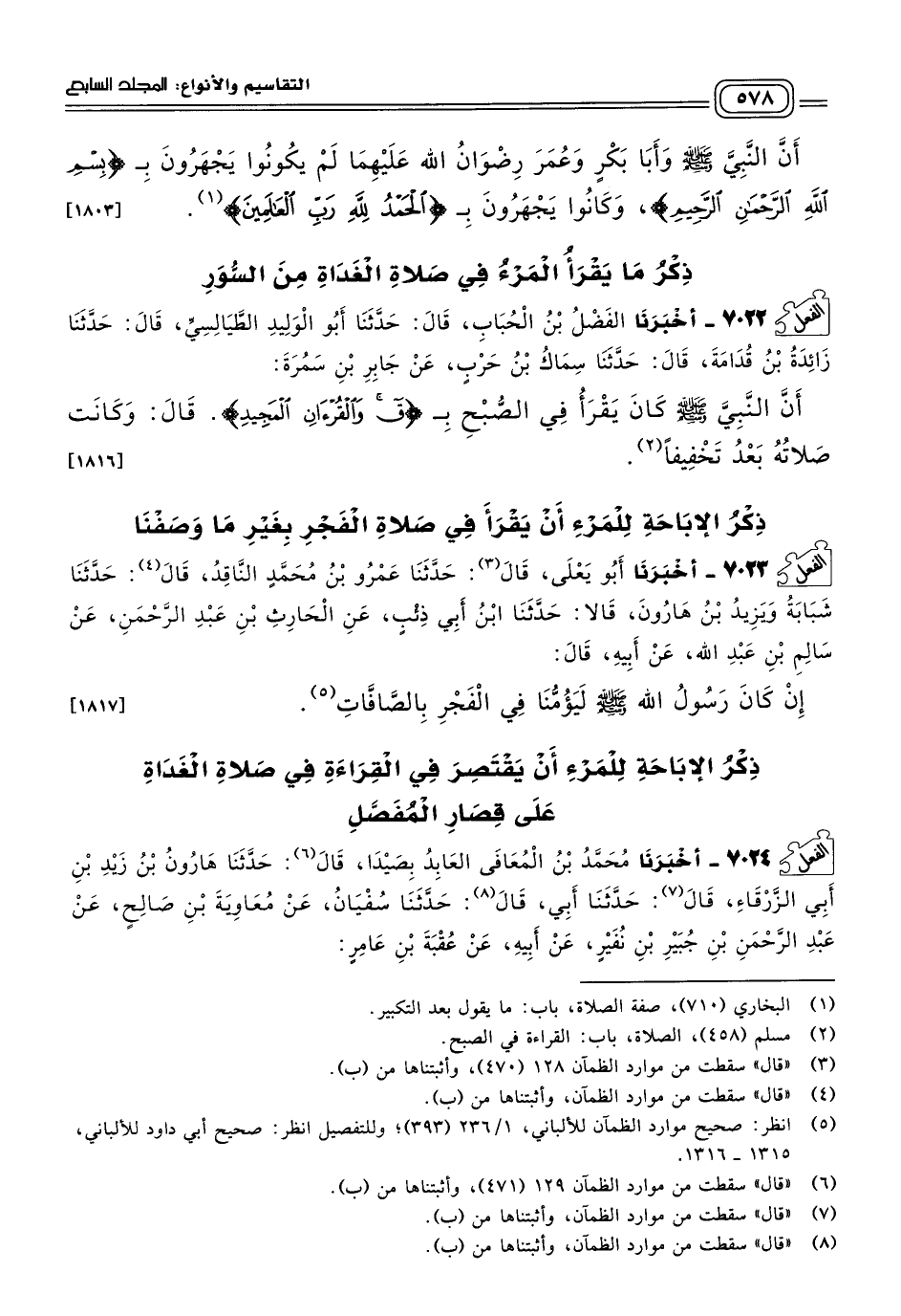 ٧٠٢٤ - أَخبَرنا مُحَمَّدُ بْنُ الْمُعَافَى، الْعَابِدُ بِصَيْدَا، قَالَ: حَدثنا هَارُونُ بْنُ زَيْدِ بْنِ أَبِي الزَّرْقَاءِ، قَالَ: حَدثنا أَبِي، قَالَ: حَدثنا سُفْيَانُ، عَنْ مُعَاوِيَةَ بْنِ صَالِحٍ، عَنْ عَبْدِ الرَّحْمَنِ بْنِ جُبَيْرِ بْنِ نُفَيْرٍ، عَنْ أَبِيهِ، عَنْ عُقْبَةَ بْنِ عَامِرٍ؛ أَنَّ النَّبِيَّ صَلى الله عَلَيه وسَلم أَمَّهُمْ بِالْمُعَوِّذَتَيْنِ فِي صَلَاةِ الصُّبْحِ. [١٨١٨]