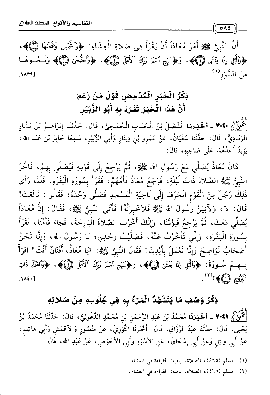 ٧٠٤٠ - أَخبَرنا الْفَضْلُ بْنُ الْحُبَابِ الْجُمَحِيُّ، قَالَ: حَدثنا إِبْرَاهِيمُ بْنُ بَشَّارٍ الرَّمَادِيُّ، قَالَ: حَدثنا سُفْيَانُ، عَنْ عَمْرِو بْنِ دِينَارٍ، وَأَبِي الزُّبَيْرِ، سَمِعَا جَابِرَ بْنَ عَبْدِ اللهِ، يَزِيدُ أَحَدُهُمَا عَلَى صَاحِبِهِ، قَالَ: كَانَ مُعَاذٌ يُصَلِّي مَعَ رَسُولِ اللهِ صَلى الله عَلَيه وسَلم، ثُمَّ يَرْجِعُ إِلَى قَوْمِهِ فَيُصَلِّي بِهِمْ، فَأَخَّرَ النَّبِيُّ صَلى الله عَلَيه وسَلم الصَّلَاةَ ذَاتَ لَيْلَةٍ، فَرَجَعَ مُعَاذٌ فَأَمَّهُمْ فَقَرَأَ بِسُورَةِ الْبَقَرَةِ، فَلَمَّا رَأَى ذَلِكَ رَجُلٌ مِنَ الْقَوْمِ، انْحَرَفَ إِلَى نَاحِيَةِ الْمَسْجِدِ، فَصَلَّى وَحْدَهُ، فَقَالُوا: نَافَقْتَ، قَالَ: لَا، وَلآتِيَنَّ رَسُولَ اللهِ صَلى الله عَلَيه وسَلم، فَلأُخْبِرَنَّهُ، فَأَتَى النَّبِيَّ صَلى الله عَلَيه وسَلم، فَقَالَ: إِنَّ مُعَاذًا يُصَلِّي مَعَكَ ثُمَّ يَرْجِعُ فَيَؤُمُّنَا، وَإِنَّكَ أَخَّرْتَ الصَّلَاةَ الْبَارِحَةَ، فَجَاءَ فَأَمَّنَا، فَقَرَأَ بِسُورَةِ الْبَقَرَةِ، وَإِنِّي تَأَخَّرْتُ عَنْهُ، فَصَلَّيْتُ وَحْدِي يَا رَسُولَ اللهِ، وَإِنَّا نَحْنُ أَصْحَابُ نَوَاضِحَ، وَإِنَّا نَعْمَلُ بِأَيْدِينَا، فَقَالَ النَّبِيُّ صَلى الله عَلَيه وسَلم: "يَا مُعَاذُ، أَفَتَّانٌ أَنْتَ! اقْرَأْ بِهِمْ سُورَةَ: {وَاللَّيْلِ إِذَا يَغْشَى}، و {سَبِّحِ اسْمَ رَبِّكَ الأَعْلَى}، {وَالسَّمَاءِ ذَاتِ الْبُرُوجِ}. [١٨٤٠]
