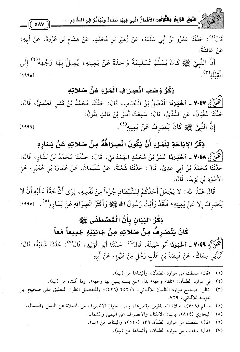 ذِكْرُ الْبَيَانِ بِأَنَّ الْمُصْطَفَى صَلى الله عَلَيه وسَلم كَانَ يَنْصَرِفُ مِنْ صَلَاتِهِ مِنْ جَانِبَيْهِ جَمِيعًا مَعًا.
