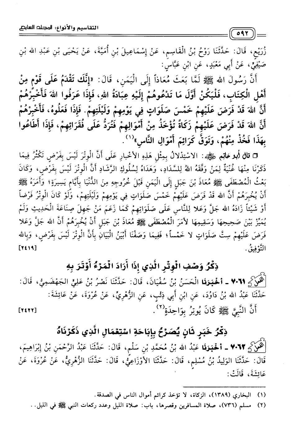 قَالَ أَبُو حَاتِمٍ رَضِيَ اللهُ عَنْهُ: الاِسْتِدْلَالُ بِمِثْلِ هَذِهِ الأَخْبَارِ عَلَى أَنَّ الْوِتْرَ لَيْسَ بِفَرْضٍ تَكْثُرُ فِيمَا ذَكَرْنَا مِنْهَا غُنْيَةٌ لِمَنْ وَفَقَّهُ اللهُ لِلسَّدَادِ، وَهَدَاهُ لِسُلُوكِ الرَّشَادِ أَنَّ الْوِتْرَ لَيْسَ بِفَرْضٍ، وَكَانَ بَعْثُ الْمُصْطَفَى صَلى الله عَلَيه وسَلم مُعَاذَ بْنَ جَبَلٍ إِلَى الْيَمَنِ قَبْلَ خُرُوجِهِ مِنَ الدُّنْيَا بِأَيَّامٍ يَسِيرَةٍ، وَأَمَرَهُ صَلى الله عَلَيه وسَلم أَنْ يُخْبِرَهُمْ أَنَّ اللهَ قَدْ فَرَضَ عَلَيْهِمْ خَمْسَ صَلَوَاتٍ فِي يَوْمِهِمْ وَلَيْلَتِهِمْ، وَلَوْ كَانَ الْوِتْرُ فَرْضًا، أَوْ شَيْئًا زَادَهُ اللهُ جَلَّ وَعَلَا لِلنَّاسِ عَلَى صَلَوَاتِهِمْ كَمَا زَعَمَ مَنْ جَهِلَ صِنَاعَةَ الْحَدِيثِ، وَلَمْ يُمَيِّزْ بَيْنَ صَحِيحِهَا وَسَقِيمِهَا، لأَمَرَ الْمُصْطَفَى صَلى الله عَلَيه وسَلم مُعَاذَ بْنَ جَبَلٍ أَنْ يُخْبِرَهُمْ أَنَّ اللهَ جَلَّ وَعَلَا فَرَضَ عَلَيْهِمْ سِتَّ صَلَوَاتٍ لَا خَمْسًا، فَفِيمَا وَصَفْنَا أَبْيَنُ الْبَيَانِ بِأَنَّ الْوِتْرَ لَيْسَ بِفَرْضٍ، وَبِاللهِ التَّوْفِيقُ. [٢٤١٩]