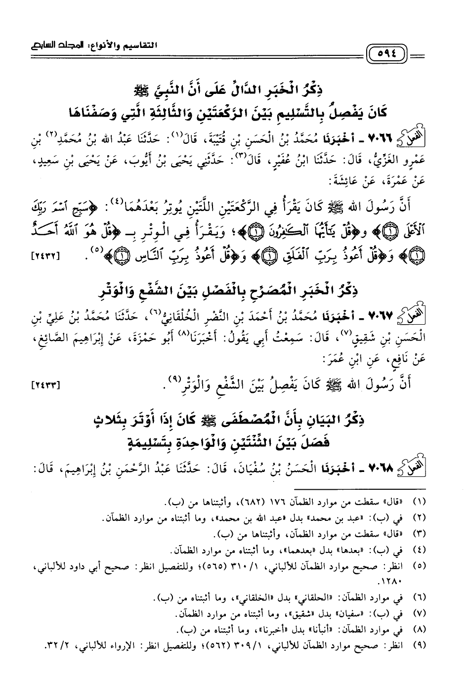 ٧٠٦٧ - أَخبَرنا مُحَمَّدُ بْنُ أَحْمَدَ بْنِ النَّضْرِ الْخُلْقَانِيُّ، حَدثنا مُحَمَّدُ بْنُ عَلِيِّ بْنِ الْحَسَنِ بْنِ شَقِيقٍ، قَالَ: سَمِعْتُ أَبِي يَقُولُ: أَخبَرنا أَبُو حَمْزَةَ، عَنْ إِبْرَاهِيمَ الصَّائِغِ، عَنْ نَافِعٍ، عَنِ ابْنِ عُمَرَ، أَنَّ رَسُولَ اللهِ صَلى الله عَلَيه وسَلم كَانَ يَفْصِلُ بَيْنَ الشَّفْعِ وَالْوِتْرِ. [٢٤٣٣]