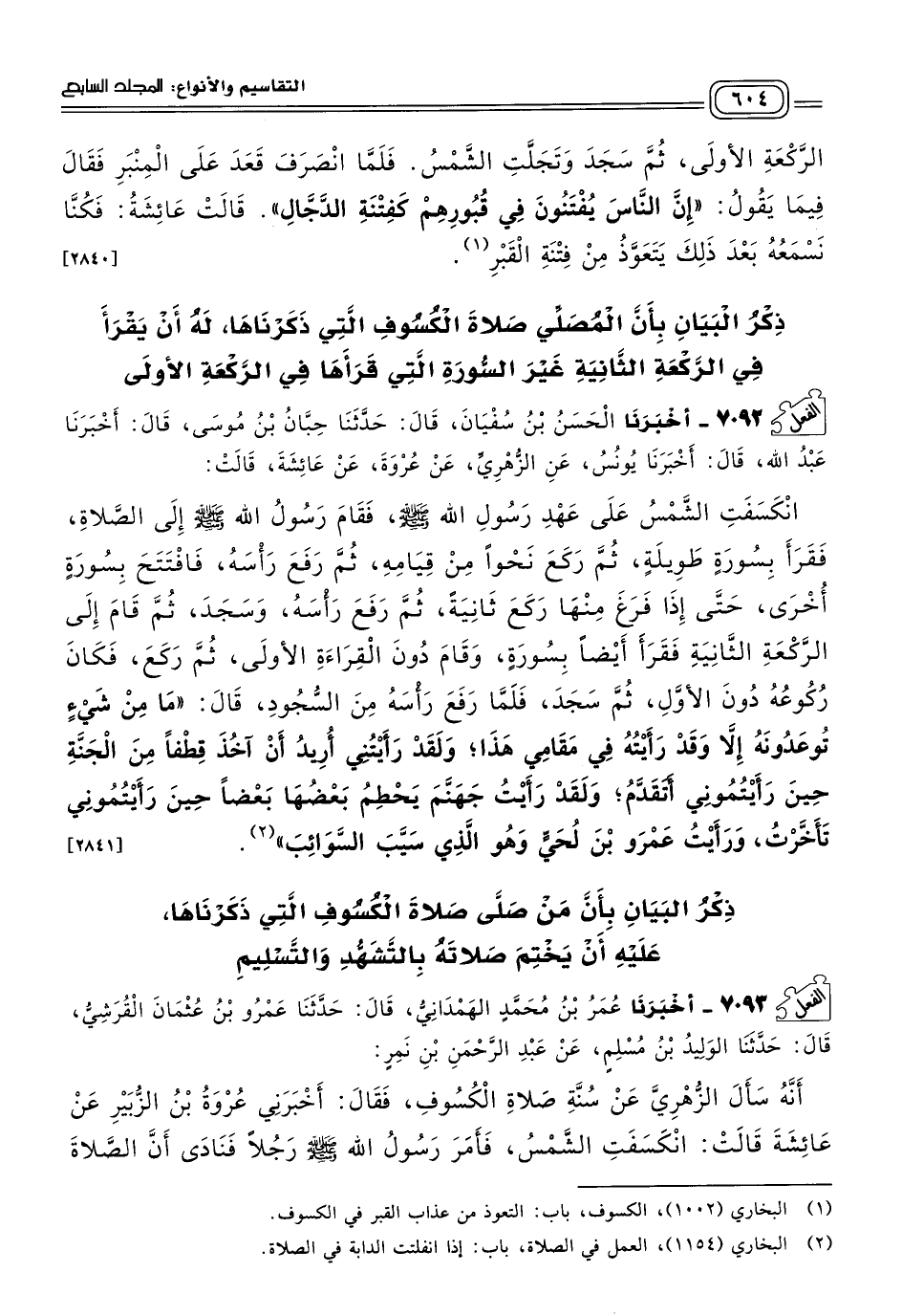 ٧٠٩٢ - أَخبَرنا الْحَسَنُ بْنُ سُفْيَانَ، قَالَ: حَدثنا حِبَّانُ بْنُ مُوسَى، قَالَ: أَخبَرنا عَبْدُ اللهِ، قَالَ: أَخبَرنا يُونُسُ، عَنِ الزُّهْرِيِّ، عَنْ عُرْوَةَ، عَنْ عَائِشَةَ، قَالَتْ: انْكَسَفَتِ الشَّمْسُ عَلَى عَهْدِ رَسُولِ اللهِ صَلى الله عَلَيه وسَلم، فَقَامَ رَسُولُ اللهِ صَلى الله عَلَيه وسَلم إِلَى الصَّلَاةِ، فَقَرَأَ بِسُورَةٍ طَوِيلَةٍ، ثُمَّ رَكَعَ نَحْوًا مِنْ قِيَامِهِ، ثُمَّ رَفَعَ رَأْسَهُ، فَافْتَتَحَ بِسُورَةٍ أُخْرَى، حَتَّى إِذَا فَرَغَ مِنْهَا رَكَعَ ثَانِيَةً، ثُمَّ رَفَعَ رَأْسَهُ وَسَجَدَ، ثُمَّ قَامَ إِلَى الرَّكْعَةِ الثَّانِيَةِ، فَقَرَأَ أَيْضًا بِسُورَةٍ، وَقَامَ دُونَ الْقِرَاءَةِ الأُولَى، ثُمَّ رَكَعَ، فَكَانَ رُكُوعُهُ دُونَ الأَوَّلِ، ثُمَّ سَجَدَ، فَلَمَّا رَفَعَ رَأْسَهُ مِنَ السُّجُودِ، قَالَ: "مَا مِنْ شَيْءٍ تُوعَدُونَهُ إِلَاّ وَقَدْ رَأَيْتُهُ فِي مَقَامِي هَذَا، وَلَقَدْ رَأَيْتُنِي أُرِيدُ أَنْ آخُذَ قِطْفًا مِنَ الْجَنَّةِ حِينَ رَأَيْتُمُونِي أَتَقَدَّمُ، وَلَقَدْ رَأَيْتُ جَهَنَّمَ يَحْطِمُ بَعْضُهَا بَعْضًا حِينَ رَأَيْتُمُونِي تَأَخَّرْتُ، وَرَأَيْتُ عَمْرَو بْنَ لُحَيٍّ وَهُوَ الَّذِي سَيَّبَ السَّوَائِبَ". [٢٨٤١]