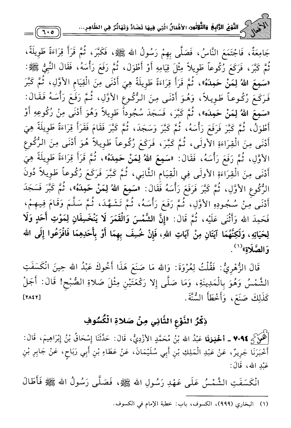 قَالَ الزُّهْرِيُّ: فَقُلْتُ لِعُرْوَةَ: وَاللهِ مَا صَنَعَ هَذَا أَخُوكَ عَبْدُ اللهِ حِينَ انْكَسَفَتِ الشَّمْسُ وَهُوَ بِالْمَدِينَةِ، وَمَا صَلَّى إِلَاّ رَكْعَتَيْنِ مِثْلَ صَلَاةِ الصُّبْحِ! قَالَ: أَجَلْ، كَذَلِكَ صَنَعَ، وَأَخْطَأَ السُّنَّةَ. [٢٨٤٢]