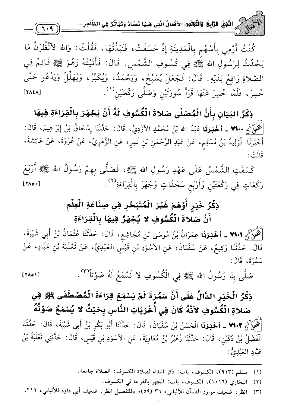 ٧١٠٠ - أَخبَرنا عَبْدُ اللهِ بْنُ مُحَمَّدٍ الأَزْدِيُّ، قَالَ: حَدثنا إِسْحَاقُ بْنُ إِبْرَاهِيمَ، قَالَ: أَخبَرنا الْوَلِيدُ بْنُ مُسْلِمٍ، عَنْ عَبْدِ الرَّحْمَنِ بْنِ نَمِرٍ، عَنِ الزُّهْرِيِّ، عَنْ عُرْوَةَ، عَنْ عَائِشَةَ، قَالَتْ: كَسَفَتِ الشَّمْسُ عَلَى عَهْدِ رَسُولِ اللهِ صَلى الله عَلَيه وسَلم، فَصَلَّى بِهِمْ رَسُولُ اللهِ صَلى الله عَلَيه وسَلم أَرْبَعَ رَكَعَاتٍ فِي رَكْعَتَيْنِ، وَأَرْبَعَ سَجَدَاتٍ، وَجَهَرَ بِالْقِرَاءَةِ. [٢٨٥٠]