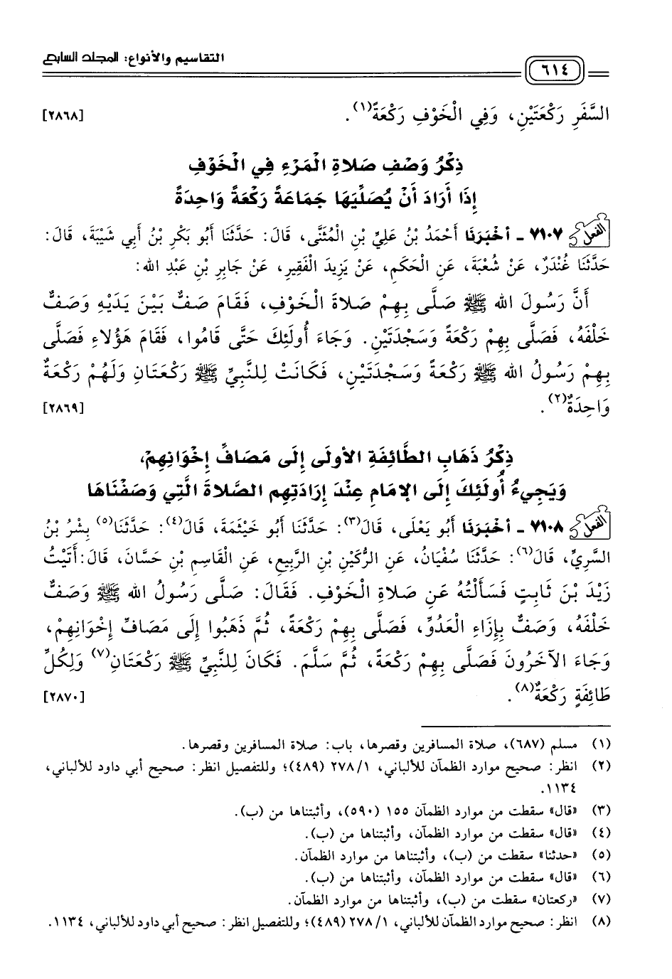 ٧١٠٨ - أَخبَرنا أَبُو يَعْلَى، قَالَ: حَدثنا أَبُو خَيْثَمَةَ، قَالَ: حَدثنا بِشْرُ بْنُ السَّرِيِّ، قَالَ: حَدثنا سُفْيَانُ، عَنِ الرُّكَيْنِ بْنِ الرَّبِيعِ، عَنِ الْقَاسِمِ بْنِ حَسَّانَ، قَالَ: أَتَيْتُ زَيْدَ بْنَ ثَابِتٍ، فَسَأَلْتُهُ عَنْ صَلَاةِ الْخَوْفِ، فَقَالَ: صَلَّى رَسُولُ اللهِ صَلى الله عَلَيه وسَلم وَصَفٌّ خَلْفَهُ، وَصَفٌّ بِإِزَاءِ الْعَدُوِّ، فَصَلَّى بِهِمْ رَكْعَةً، ثُمَّ ذَهَبُوا إِلَى مَصَافِّ إِخْوَانِهِمْ، وَجَاءَ الآخَرُونَ فَصَلَّى بِهِمْ رَكْعَةً، ثُمَّ سَلَّمَ، فَكَانَ لِلنَّبِيِّ صَلى الله عَلَيه وسَلم رَكْعَتَانِ، وَلِكُلِّ طَائِفَةٍ رَكْعَةٌ. [٢٨٧٠]