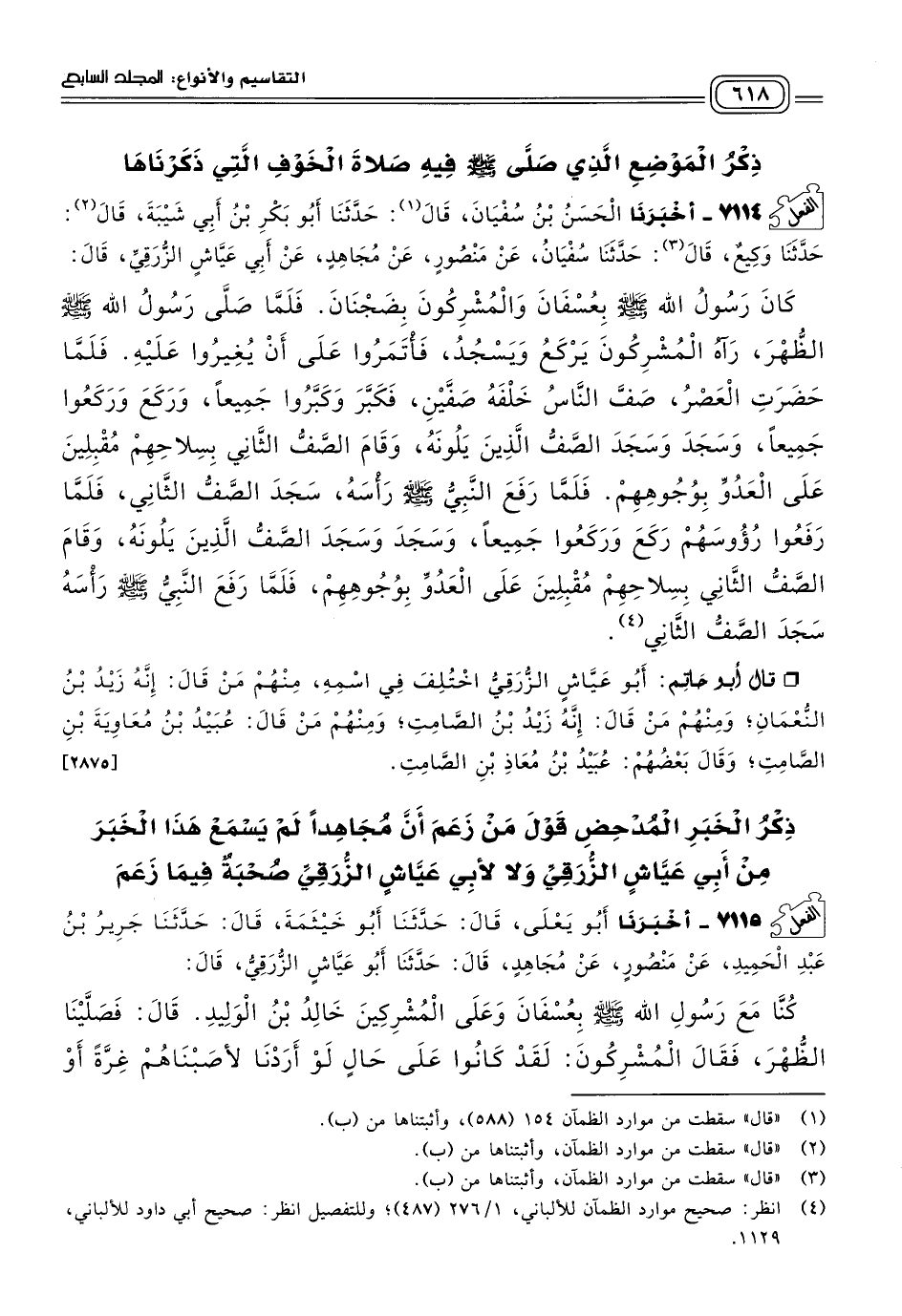٧١١٤ - أَخبَرنا الْحَسَنُ بْنُ سُفْيَانَ، قَالَ: حَدثنا أَبُو بَكْرِ بْنُ أَبِي شَيْبَةَ، قَالَ: حَدثنا وَكِيعٌ، قَالَ: حَدثنا سُفْيَانُ، عَنْ مَنْصُورٍ، عَنْ مُجَاهِدٍ، عَنْ أَبِي عَيَّاشٍ الزُّرَقِيِّ، قَالَ: كَانَ رَسُولُ اللهِ صَلى الله عَلَيه وسَلم بِعُسْفَانَ وَالْمُشْرِكُونَ بِضَجْنَانَ، فَلَمَّا صَلَّى رَسُولُ اللهِ صَلى الله عَلَيه وسَلم الظُّهْرَ، رَآهُ الْمُشْرِكُونَ يَرْكَعُ وَيَسْجُدُ، فَأْتَمَرُوا عَلَى أَنْ يُغِيرُوا عَلَيْهِ، فَلَمَّا حَضَرَتِ الْعَصْرُ، صَفَّ النَّاسُ خَلْفَهُ صَفَّيْنِ، فَكَبَّرَ وَكَبَّرُوا جَمِيعًا، وَرَكَعَ وَرَكَعُوا جَمِيعًا، وَسَجَدَ وَسَجَدَ الصَّفُّ الَّذِينَ يَلُونَهُ، وَقَامَ الصَّفُّ الثَّانِي بِسِلَاحِهِمْ مُقْبِلِينَ عَلَى الْعَدُوِّ بِوُجُوهِهِمْ، فَلَمَّا رَفَعَ النَّبِيُّ صَلى الله عَلَيه وسَلم رَأْسَهُ، سَجَدَ الصَّفُّ الثَّانِي، فَلَمَّا رَفَعُوا رُؤُوسَهُمْ رَكَعَ وَرَكَعُوا جَمِيعًا، وَسَجَدَ وَسَجَدَ الصَّفُّ الَّذِينَ يَلُونَهُ، وَقَامَ الصَّفُّ الثَّانِي بِسِلَاحِهِمْ مُقْبِلِينَ عَلَى الْعَدُوِّ بِوُجُوهِهِمْ، فَلَمَّا رَفَعَ النَّبِيُّ صَلى الله عَلَيه وسَلم رَأْسَهُ سَجَدَ الصَّفُّ الثَّانِي.