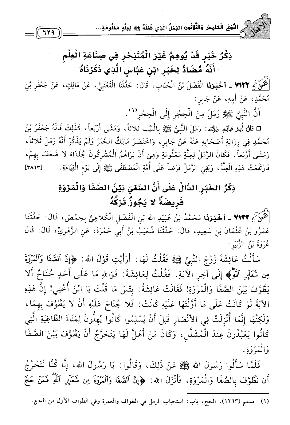 قَالَ أَبُو حَاتِمٍ رَضِيَ اللهُ عَنْهُ: رَمَلَ النَّبِيُّ صَلى الله عَلَيه وسَلم بِالْبَيْتِ ثَلَاثًا، وَمَشَى أَرْبَعًا، كَذَلِكَ قَالَهُ جَعْفَرُ بْنُ مُحَمَّدٍ فِي رِوَايَةِ أَصْحَابِهِ عَنْهُ عَنْ جَابِرٍ، وَاخْتَصَرَ مَالِكٌ الْخَبَرَ وَلَمْ يَذْكُرْ أَنَّهُ رَمَلَ ثَلَاثًا، وَمَشَى أَرْبَعًا، فَكَانَ الرَّمَلُ لِعِلَّةٍ مَعْلُومَةٍ، وَهِيَ أَنْ يَرَاهُمُ الْمُشْرِكُونَ جُلَدَاءَ لَا ضَعْفَ بِهِمْ، فَارْتَفَعَتْ هَذِهِ الْعِلَّةُ، وَبَقِيَ الرَّمَلُ فَرْضًا عَلَى أُمَّةِ الْمُصْطَفَى صَلى الله عَلَيه وسَلم إِلَى يَوْمِ الْقِيَامَةِ. [٣٨١٣]