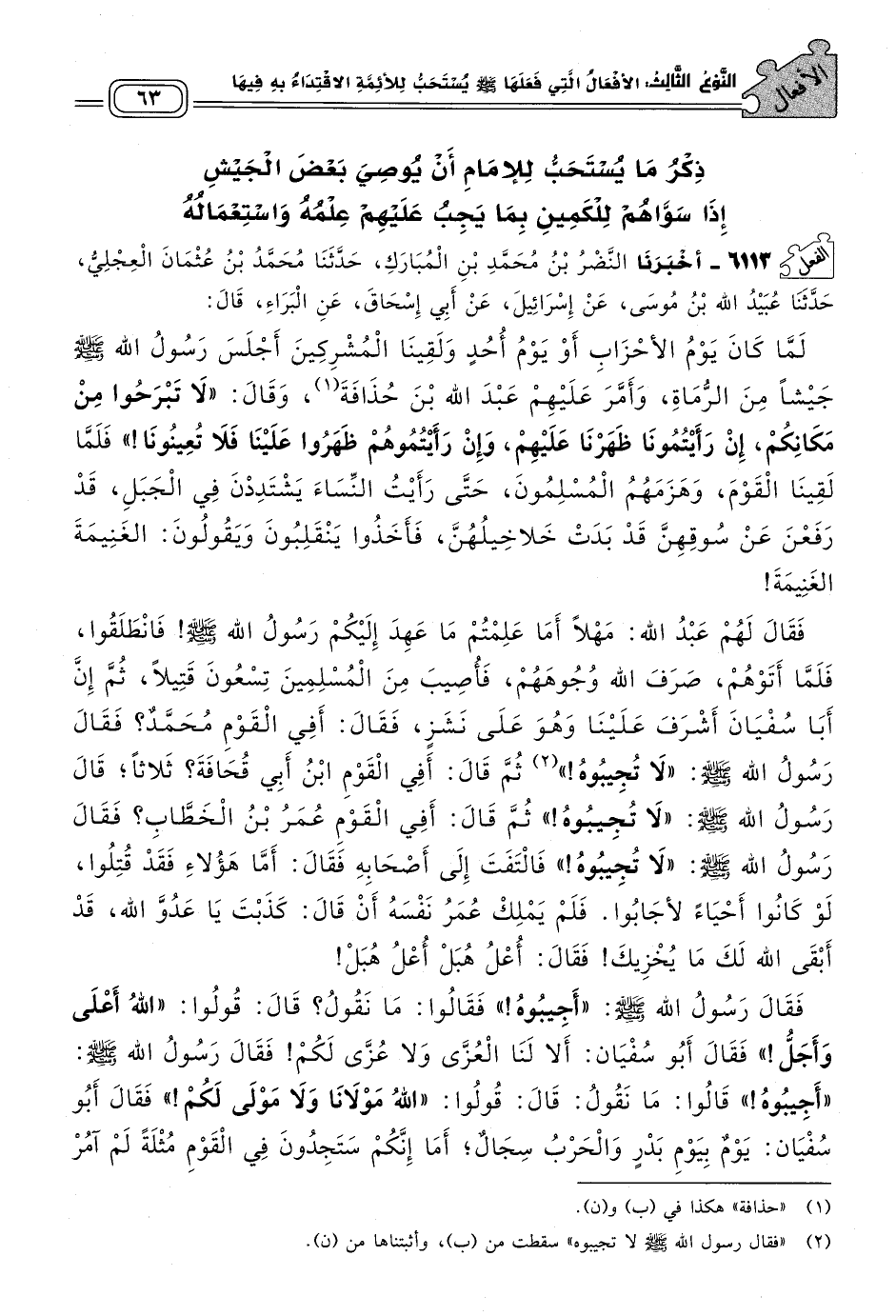 ٦١١٣ - أَخبَرنا النَّضْرُ بْنُ مُحَمَّدِ بْنِ الْمُبَارَكِ، حَدثنا مُحَمَّدُ بْنُ عُثْمَانَ الْعِجْلِيُّ، حَدثنا عُبَيْدُ اللهِ بْنُ مُوسَى، عَنْ إِسْرَائِيلَ، عَنْ أَبِي إِسْحَاقَ، عَنِ الْبَرَاءِ، قَالَ: لَمَّا كَانَ يَوْمُ الأَحْزَابِ، أَوْ يَوْمُ أُحُدٍ، وَلَقِينَا الْمُشْرِكِينَ أَجْلَسَ رَسُولُ اللهِ صَلى الله عَلَيه وسَلم جَيْشًا مِنَ الرُّمَاةِ، وَأَمَّرَ عَلَيْهِمْ عَبْدَ اللهِ بْنَ حُذَافَةَ، وَقَالَ: "لَا تَبْرَحُوا مِنْ مَكَانِكُمْ إِنْ رَأَيْتُمُونَا ظَهَرْنَا عَلَيْهِمْ، وَإِنْ رَأَيْتُمُوهُمْ ظَهَرُوا عَلَيْنَا فَلَا تُعِينُونَا"، فَلَمَّا لَقِينَا الْقَوْمَ وَهَزَمَهُمُ الْمُسْلِمُونَ، حَتَّى رَأَيْتُ النِّسَاءَ يَشْتَدِدْنَ فِي الْجَبَلِ، قَدْ رَفَعْنَ عَنْ سُوقِهِنَّ قَدْ بَدَتْ خَلَاخِيلُهُنَّ، فَأَخَذُوا يَنْقَلِبُونَ وَيَقُولُونَ: الْغَنِيمَةَ الْغَنِيمَةَ! فَقَالَ لَهُمْ عَبْدُ اللهِ: مَهْلاً أَمَا عَلِمْتُمْ مَا عَهِدَ إِلَيْكُمْ رَسُولُ اللهِ صَلى الله عَلَيه وسَلم! فَانْطَلَقُوا، فَلَمَّا أَتَوْهُمْ، صَرَفَ اللهُ وجُوهَهُمْ، فَأُصِيبَ مِنَ الْمُسْلِمِينَ تِسْعُونَ قَتِيلاً،