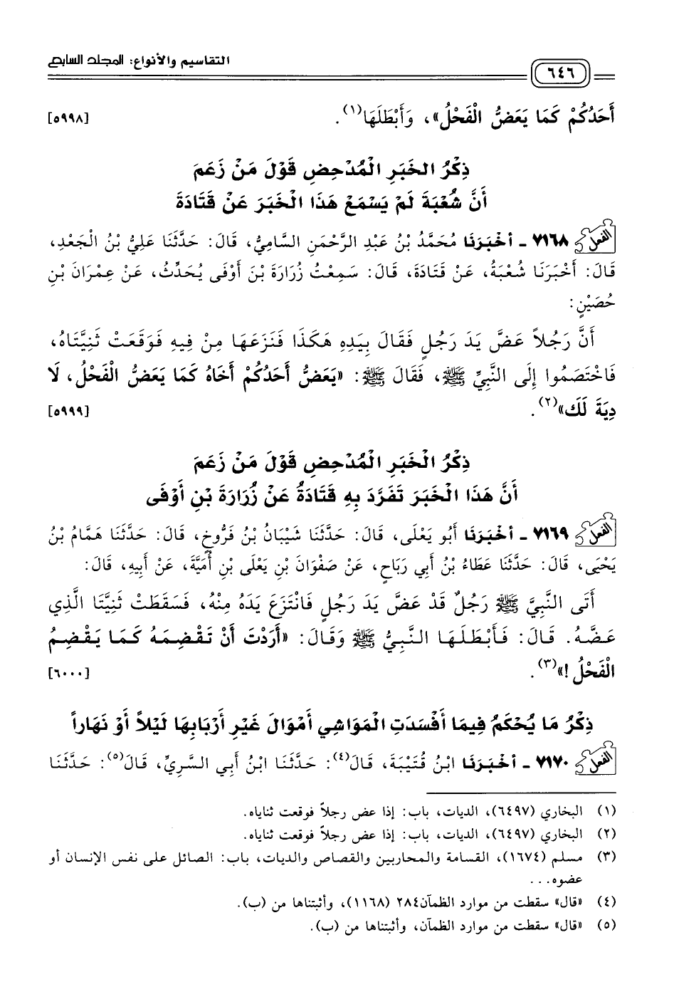 ٧١٦٨ - أَخبَرنا مُحَمَّدُ بْنُ عَبْدِ الرَّحْمَنِ السَّامِيُّ، قَالَ: حَدثنا عَلِيُّ بْنُ الْجَعْدِ، قَالَ: أَخبَرنا شُعْبَةُ، عَنْ قَتَادَةَ، قَالَ: سَمِعْتُ زُرَارَةَ بْنَ أَوْفَى يُحَدِّثُ، عَنْ عِمْرَانَ بْنِ حُصَيْنٍ، أَنَّ رَجُلاً عَضَّ يَدَ رَجُلٍ، فَقَالَ بِيَدِهِ هَكَذَا، فَنَزَعَهَا مِنْ فِيهِ، فَوَقَعَتْ ثَنِيَّتَاهُ، فَاخْتَصَمُوا إِلَى النَّبِيِّ صَلى الله عَلَيه وسَلم، فَقَالَ صَلى الله عَلَيه وسَلم: "يَعَضُّ أَحَدُكُمْ أَخَاهُ كَمَا يَعَضُّ الْفَحْلُ! لَا دِيَةَ لَكَ". [٥٩٩٩]