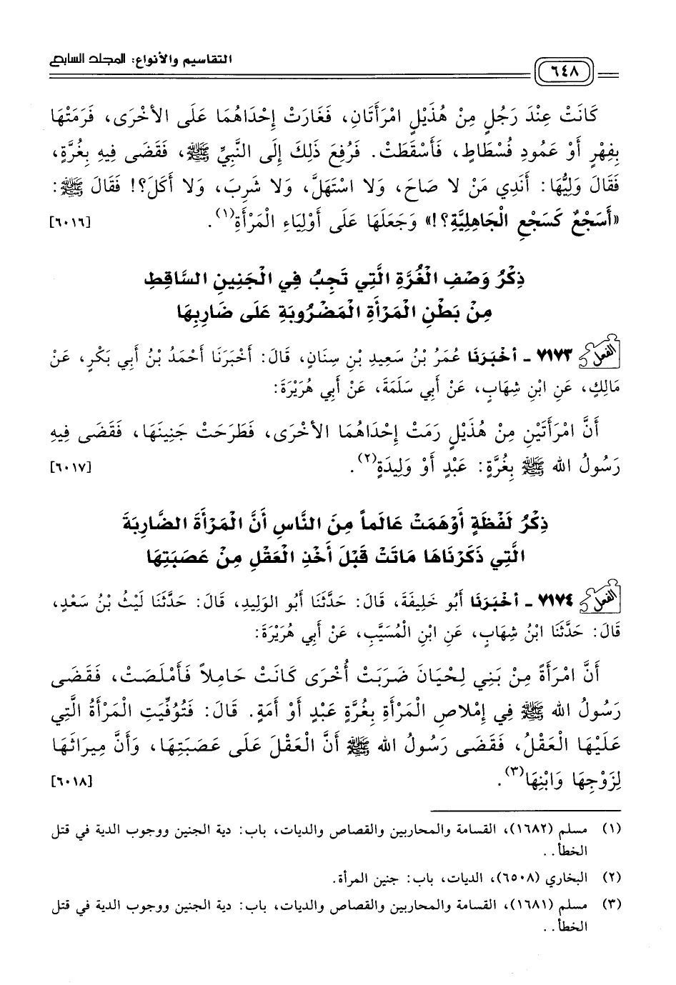 ٧١٧٣ - أَخبَرنا عُمَرُ بْنُ سَعِيدِ بْنِ سِنَانٍ، قَالَ: أَخبَرنا أَحْمَدُ بْنُ أَبِي بَكْرٍ، عَنْ مَالِكٍ، عَنِ ابْنِ شِهَابٍ، عَنْ أَبِي سَلَمَةَ، عَنْ أَبِي هُرَيْرَةَ، أَنَّ امْرَأَتَيْنِ مِنْ هُذَيْلٍ رَمَتْ إِحْدَاهُمَا الأُخْرَى، فَطَرَحَتْ جَنِينَهَا، فَقَضَى فِيهِ رَسُولُ اللهِ صَلى الله عَلَيه وسَلم بِغُرَّةٍ: عَبْدٍ أَوْ وَلِيدَةٍ. [٦٠١٧]