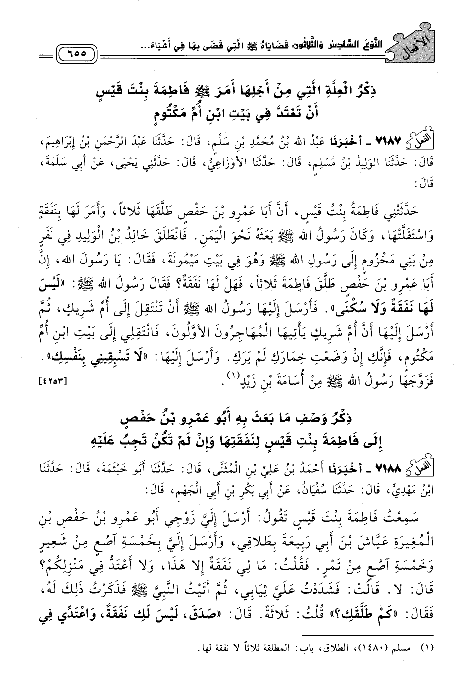 ٧١٨٨ - أَخبَرنا أَحْمَدُ بْنُ عَلِيِّ بْنِ الْمُثَنَّى، قَالَ: حَدثنا أَبُو خَيْثَمَةَ، قَالَ: حَدثنا ابْنُ مَهْدِيٍّ، قَالَ حَدثنا سُفْيَانُ، عَنْ أَبِي بَكْرِ بْنِ أَبِي الْجَهْمِ، قَالَ: سَمِعْتُ فَاطِمَةَ بِنْتَ قَيْسٍ تَقُولُ: أَرْسَلَ إِلَيَّ زَوْجِي أَبُو عَمْرِو بْنُ حَفْصِ بْنِ الْمُغِيرَةِ عَيَّاشَ بْنَ أَبِي رَبِيعَةَ بِطَلَاقِي، وَأَرْسَلَ إِلَيَّ بِخَمْسَةِ آصُعٍ مِنْ شَعِيرٍ، وَخَمْسَةِ آصُعٍ مِنْ تَمْرٍ، فَقُلْتُ: مَا لِي نَفَقَةٌ إِلَاّ هَذَا، وَلَا أَعْتَدُّ فِي مَنْزِلِكُمْ؟ قَالَ: لَا، قَالَتْ: فَشَدَدْتُ عَلَيَّ ثِيَابِي، ثُمَّ أَتَيْتُ النَّبِيَّ صَلى الله عَلَيه وسَلم فَذَكَرْتُ ذَلِكَ لَهُ، فَقَالَ: "كَمْ طَلَّقَكِ؟ " قُلْتُ: ثَلَاثَةً، قَالَ: "صَدَقَ، لَيْسَ لَكِ نَفَقَةٌ، وَاعْتَدِّي فِي بَيْتِ ابْنِ عَمِّكِ ابْنِ أُمِّ مَكْتُومٍ، فَإِنَّهُ ضَرِيرُ الْبَصَرِ، تُلْقِينَ ثَوْبَكِ عِنْدَهُ، فَإِذَا انْقَضَتْ عِدَّتُكِ فَآذِنِينِي"، قَالَتْ: فَخَطَبَنِي خُطَّابٌ، مِنْهُمْ مُعَاوِيَةُ وَأَبُو جَهْمٍ، فَقَالَ رَسُولُ اللهِ صَلى الله عَلَيه وسَلم: "إِنَّ مُعَاوِيَةَ خَفِيفُ الْحَاذِ، وَأَبُو جَهْمٍ فِيهِ شِدَّةٌ عَلَى النِّسَاءِ، أَوْ يَضْرِبُ النِّسَاءَ، أَوْ نَحْوَ هَذَا، وَلَكِنْ عَلَيْكِ بِأُسَامَةَ بْنِ زَيْدٍ". [٤٢٥٤]