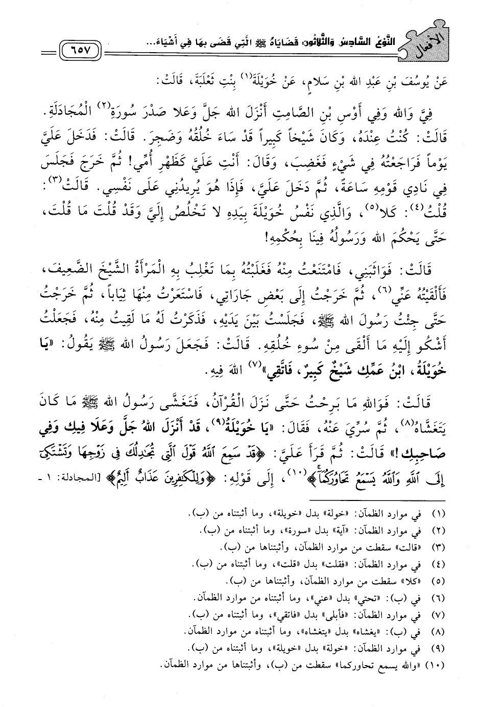 فَجَلَسْتُ بَيْنَ يَدَيْهِ، فَذَكَرْتُ لَهُ مَا لَقِيتُ مِنْهُ، فَجَعَلْتُ أَشْكُو إِلَيْهِ مَا أَلْقَى مِنْ سُوءِ خُلُقِهِ، قَالَتْ: فَجَعَلَ رَسُولُ اللهِ صَلى الله عَلَيه وسَلم يَقُولُ: "يَا خُوَيْلَةُ، ابْنُ عَمِّكِ شَيْخٌ كَبِيرٌ، فَاتَّقِي اللهَ فِيهِ"، قَالَتْ: فَوَاللهِ مَا بَرِحْتُ حَتَّى نَزَلَ الْقُرْآنُ، فَتَغَشَّى رَسُولُ اللهِ صَلى الله عَلَيه وسَلم مَا كَانَ يَتَغَشَّاهُ، ثُمَّ سُرِّيَ عَنْهُ، فَقَالَ: "يَا خُوَيْلَةُ، قَدْ أَنْزَلَ اللهُ جَلَّ وَعَلَا فِيكِ وَفِي صَاحِبِكِ"، قَالَتْ: ثُمَّ قَرَأَ عَلَيَّ: {قَدْ سَمِعَ اللهُ قَوْلَ الَّتِي تُجَادِلُكَ فِي زَوْجِهَا وَتَشْتَكِي إِلَى اللهِ وَاللَّهُ يَسْمَعُ تَحَاوُرَكُمَا}، إِلَى قَوْلِهِ: {وَلِلْكَافِرِينَ عَذَابٌ أَلِيمٌ} [المجادلة: ١ - ٤]، فَقَالَ رَسُولُ اللهِ صَلى الله عَلَيه وسَلم: "مُرِيهِ فَلْيَعْتِقْ رَقَبَةً"، قَالَتْ: وَقُلْتُ: يَا رَسُولَ اللهِ، مَا عِنْدَهُ مَا يَعْتِقُ، قَالَ: "فَلْيَصُمْ شَهْرَيْنِ مُتَتَابِعَيْنِ"، قَالَتْ: فَقُلْتُ: وَاللهِ يَا رَسُولَ اللهِ، إِنَّهُ شَيْخٌ كَبِيرٌ مَا بِهِ مِنْ صِيَامٍ، قَالَ: "فَلْيُطْعِمْ سِتِّينَ مِسْكِينًا وَسْقًا مِنْ تَمْرٍ"، فَقُلْتُ: وَاللهِ يَا رَسُولَ اللهِ، مَا ذَلِكَ عِنْدَهُ، قَالَتْ: فَقَالَ رَسُولُ اللهِ صَلى الله عَلَيه وسَلم: "فَإِنَّا سَنُعِينُهُ بِعَرَقٍ مِنْ تَمْرٍ"، قَالَتْ: فَقُلْتُ: وَأَنَا يَا رَسُولَ اللهِ سَأُعِينُهُ بِعَرَقٍ آخَرَ، فَقَالَ رَسُولُ اللهِ صَلى الله عَلَيه وسَلم: "أَصَبْتِ وَأَحْسَنْتِ، فَاذْهَبِي فَتَصَدَّقِي بِهِ عَنْهُ، ثُمَّ اسْتَوْصِي بِابْنِ عَمِّكِ خَيْرًا"، قَالَتْ: فَفَعَلْتُ. [٤٢٧٩]