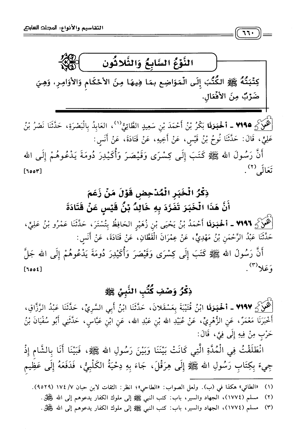 ٧١٩٥ - أَخبَرنا بَكْرُ بْنُ أَحْمَدَ بْنِ سَعِيدٍ الطَّائِيُّ الْعَابِدُ بِالْبَصْرَةِ، حَدثنا نَصْرُ بْنُ عَلِيٍّ، قَالَ: حَدثنا نُوحُ بْنُ قَيْسٍ، عَنْ أَخِيهِ، عَنْ قَتَادَةَ، عَنْ أَنَسٍ؛ أَنَّ رَسُولَ اللهِ صَلى الله عَلَيه وسَلم كَتَبَ إِلَى كِسْرَى وَقَيْصَرَ وَأُكَيْدِرَ دُومَةَ يَدْعُوهُمْ إِلَى اللهِ تَعَالَى. [٦٥٥٣]