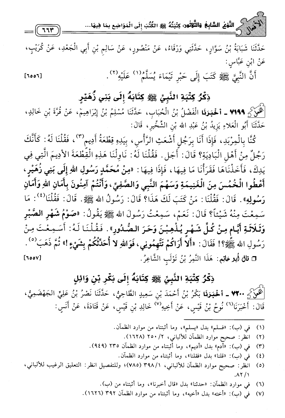 ٧١٩٩ - أَخبَرنا الْفَضْلُ بْنُ الْحُبَابِ، حَدثنا مُسْلِمُ بْنُ إِبْرَاهِيمَ، عَنْ قُرَّةَ بْنِ خَالِدٍ، حَدثنا أَبُو الْعَلَاءِ يَزِيدُ بْنُ عَبْدِ اللهِ بْنِ الشِّخِّيرِ، قَالَ: كُنَّا بِالْمِرْبَدِ، فَإِذَا أَنَا بِرَجُلٍ أَشْعَثِ الرَّأْسِ بِيَدِهِ قِطْعَةُ أَدِيمٍ، فَقُلْنَا لَهُ: كَأَنَّكَ رَجُلٌ مِنْ أَهْلِ الْبَادِيَةِ؟ قَالَ: أَجَلْ، فَقُلْنَا لَهُ: نَاوِلْنَا هَذِهِ الْقِطْعَةَ الأَدِيمِ الَّتِي فِي يَدِكَ، فَأَخْذَنَاهَا، فَقَرَأْنَا مَا فِيهَا، فَإِذَا فِيهَا: "مِنْ مُحَمَّدٍ رَسُولِ اللهِ إِلَى بَنِي زُهَيْرٍ، أَعْطُوا الْخُمُسَ مِنَ الْغَنِيمَةِ، وَسَهْمَ النَّبِيِّ وَالصَّفِيِّ، وَأَنْتُمْ آمِنُونَ بِأَمَانِ اللهِ وَأَمَانِ رَسُولِهِ"، قَالَ: فَقُلْنَا: مَنْ كَتَبَ لَكَ هَذَا؟ قَالَ: رَسُولُ اللهِ صَلى الله عَلَيه وسَلم، قَالَ: فَقُلْنَا: مَا سَمِعْتَ مِنْهُ شَيْئًا؟ قَالَ: نَعَمْ، سَمِعْتُ رَسُولَ اللهِ صَلى الله عَلَيه وسَلم يَقُولُ: "صَوْمُ شَهْرِ الصَّبْرِ وَثَلَاثَةِ أَيَّامٍ مِنْ كُلِّ شَهْرٍ يُذْهِبْنَ وَحَرَ الصُّدُورِ"، فَقُلْنَا لَهُ: أَسَمِعْتَ مِنْ رَسُولِ اللهِ صَلى الله عَلَيه وسَلم؟! فَقَالَ: "أَلَا أَرَاكُمْ تَتَّهِمُونِي، فَوَاللهِ لَا أُحَدِّثُكُمْ بِشَيْءٍ! " ثُمَّ ذَهَبَ.