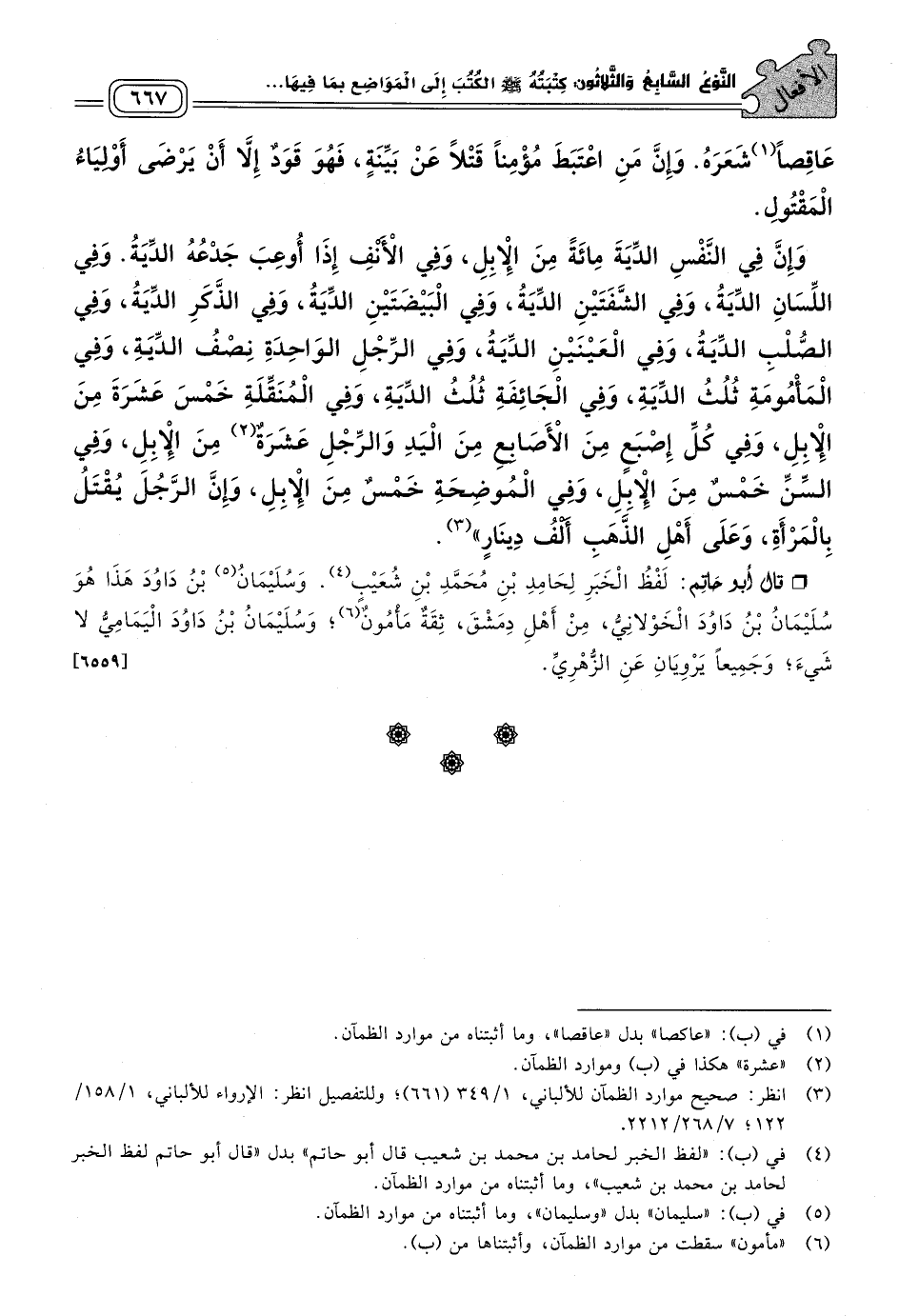 وَفِي الأَنْفِ إِذَا أُوعِبَ جَدْعُهُ الدِّيَةُ، وَفِي اللِّسَانِ الدِّيَةُ، وَفِي الشَّفَتَيْنِ الدِّيَةُ، وَفِي الْبَيْضَتَيْنِ الدِّيَةُ، وَفِي الذَّكَرِ الدِّيَةُ، وَفِي الصُّلْبِ الدِّيَةُ، وَفِي الْعَيْنَيْنِ الدِّيَةُ، وَفِي الرِّجْلِ الْوَاحِدَةِ نِصْفُ الدِّيَةِ، وَفِي الْمَأْمُومَةِ ثُلُثُ الدِّيَةِ، وَفِي الْجَائِفَةِ ثُلُثُ الدِّيَةِ، وَفِي الْمُنَقِّلَةِ خَمْسَ عَشْرَةَ مِنَ الإِبِلِ، وَفِي كُلِّ إِصْبَعٍ مِنَ الأَصَابِعِ مِنَ الْيَدِ وَالرِّجْلِ عَشْرَةٌ مِنَ الإِبِلِ، وَفِي السِّنِّ خَمْسٌ مِنَ الإِبِلِ، وَفِي الْمُوضِحَةِ خَمْسٌ مِنَ الإِبِلِ، وَإِنَّ الرَّجُلَ يُقْتَلُ بِالْمَرْأَةِ، وَعَلَى أَهْلِ الذَّهَبِ أَلْفُ دِينَارٍ".