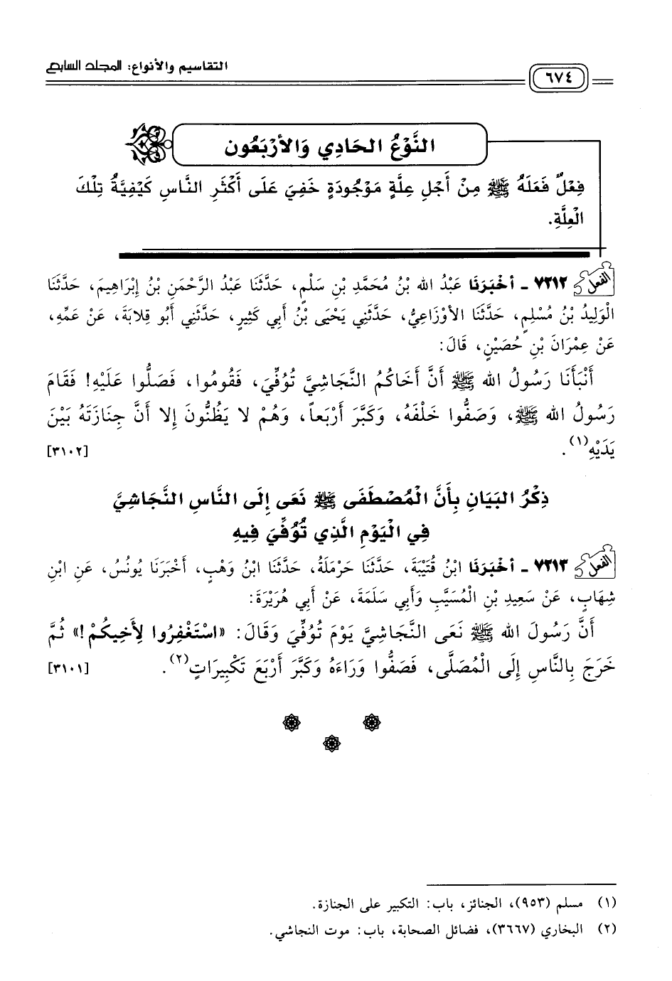 ٧٢١٢ - أَخبَرنا عَبْدُ اللهِ بْنُ مُحَمَّدِ بْنِ سَلْمٍ، حَدثنا عَبْدُ الرَّحْمَنِ بْنُ إِبْرَاهِيمَ، حَدثنا الْوَلِيدُ بْنُ مُسْلِمٍ، حَدثنا الأَوْزَاعِيُّ، حَدَّثَنِي يَحْيَى بْنُ أَبِي كَثِيرٍ، حَدَّثَنِي أَبُو قِلَابَةَ، عَنْ عَمِّهِ، عَنْ عِمْرَانَ بْنِ حُصَيْنٍ، قَالَ: أَنْبَأَنَا رَسُولُ اللهِ صَلى الله عَلَيه وسَلم أَنَّ أَخَاكُمُ النَّجَاشِيَّ تُوُفِّيَ، فَقُومُوا فَصَلُّوا عَلَيْهِ، فَقَامَ رَسُولُ اللهِ صَلى الله عَلَيه وسَلم، وَصَفُّوا خَلْفَهُ، وَكَبَّرَ أَرْبَعًا، وَهُمْ لَا يَظُنُّونَ إِلَاّ أَنَّ جِنَازَتَهُ بَيْنَ يَدَيْهِ. [٣١٠٢]