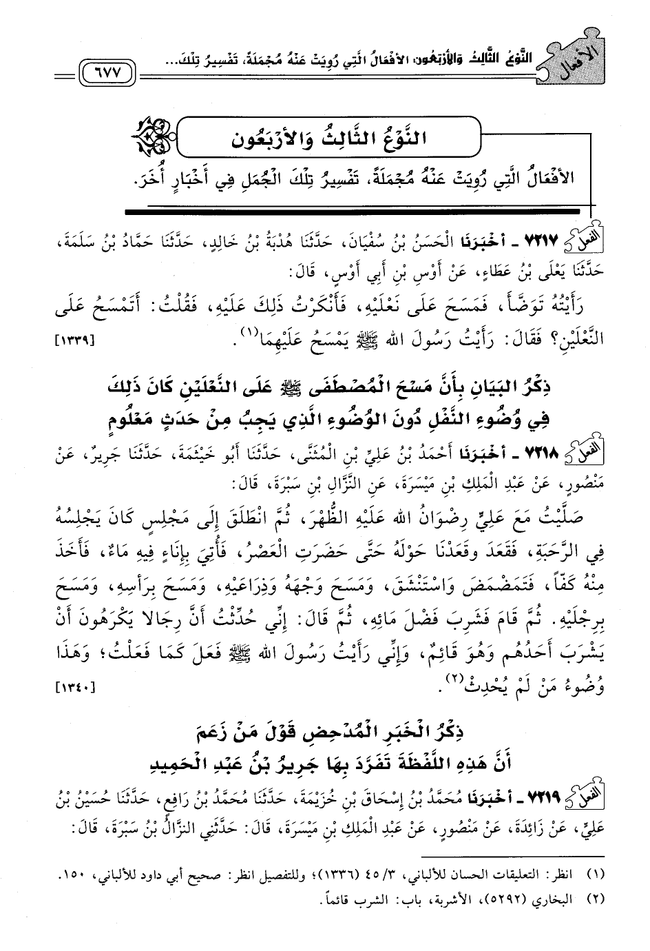 ٧٢١٧ - أَخبَرنا الْحَسَنُ بْنُ سُفْيَانَ، حَدثنا هُدْبَةُ بْنُ خَالِدٍ، حَدثنا حَمَّادُ بْنُ سَلَمَةَ، حَدثنا يَعْلَى بْنُ عَطَاءٍ، عَنْ أَوْسِ بْنِ أَبِي أَوْسٍ، قَالَ: رَأَيْتُهُ تَوَضَّأَ، فَمَسَحَ عَلَى نَعْلَيْهِ، فَأَنْكَرْتُ ذَلِكَ عَلَيْهِ، فَقُلْتُ: أَتَمْسَحُ عَلَى النَّعْلَيْنِ؟ فَقَالَ: رَأَيْتُ رَسُولَ اللهِ صَلى الله عَلَيه وسَلم يَمْسَحُ عَلَيْهِمَا. [١٣٣٩]