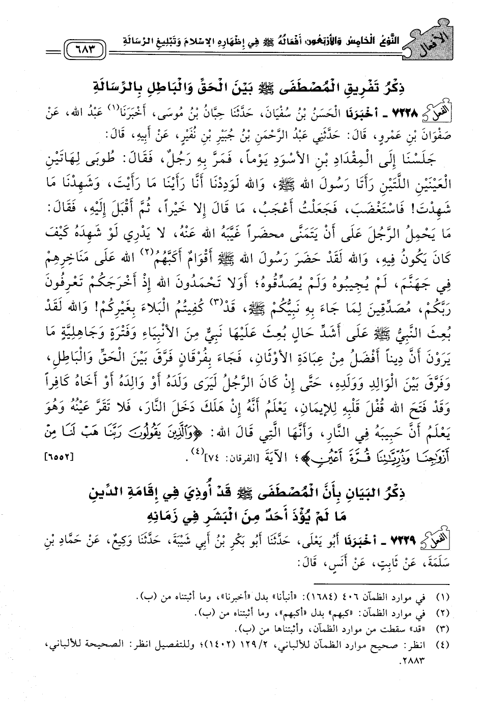 ٧٢٢٨ - أَخبَرنا الْحَسَنُ بْنُ سُفْيَانَ، حَدثنا حِبَّانُ بْنُ مُوسَى، أَخبَرنا عَبْدُ اللهِ، عَنْ صَفْوَانَ بْنِ عَمْرٍو، قَالَ: حَدَّثَنِي عَبْدُ الرَّحْمَنِ بْنُ جُبَيْرِ بْنِ نُفَيْرٍ، عَنْ أَبِيهِ، قَالَ: جَلَسْنَا إِلَى الْمِقْدَادِ بْنِ الأَسْوَدِ يَوْمًا، فَمَرَّ بِهِ رَجُلٌ، فَقَالَ: طُوبَى لِهَاتَيْنِ الْعَيْنَيْنِ اللَّتَيْنِ رَأَتَا رَسُولَ اللهِ صَلى الله عَلَيه وسَلم، وَاللهِ لَوَدِدْنَا أَنَّا رَأَيْنَا مَا رَأَيْتَ، وَشَهِدْنَا مَا شَهِدْتَ، فَاسْتَغْضَبَ، فَجَعَلْتُ أَعْجَبُ، مَا قَالَ إِلَاّ خَيْرًا، ثُمَّ أَقْبَلَ إِلَيْهِ، فَقَالَ: مَا يَحْمِلُ الرَّجُلَ عَلَى أَنْ يَتَمَنَّى مُحْضَرًا غَيَّبَهُ اللهُ عَنْهُ، لَا يَدْرِي لَوْ شَهِدَهُ كَيْفَ كَانَ يَكُونُ فِيهِ، وَاللهِ لَقَدْ حَضَرَ رَسُولَ اللهِ صَلى الله عَلَيه وسَلم أَقْوَامٌ أَكَبَّهُمُ اللهُ عَلَى مَنَاخِرِهِمْ فِي جَهَنَّمَ، لَمْ يُجِيبُوهُ وَلَمْ يُصَدِّقُوهُ، أَوَلَا تَحْمَدُونَ اللهَ إِذْ أَخْرَجَكُمْ تَعْرِفُونَ رَبَّكُمْ، مُصَدِّقِينَ لِمَا جَاءَ بِهِ نَبِيُّكُمْ صَلى الله عَلَيه وسَلم، قَدْ كُفِيتُمُ الْبَلَاءَ بِغَيْرِكُمْ! وَاللهِ لَقَدْ بُعِثَ النَّبِيُّ صَلى الله عَلَيه وسَلم عَلَى أَشَدِّ حَالٍ بُعِثَ عَلَيْهَا نَبِيٌّ مِنَ الأَنْبِيَاءِ وَفَتْرَةٍ وَجَاهِلِيَّةٍ مَا يَرَوْنَ أَنَّ دِينًا أَفْضَلُ مِنْ عِبَادَةِ الأَوْثَانِ، فَجَاءَ بِفُرْقَانٍ فَرَّقَ بَيْنَ الْحَقِّ وَالْبَاطِلِ، وَفَرَّقَ بَيْنَ الْوَالِدِ وَوَلَدِهِ، حَتَّى إِنْ كَانَ الرَّجُلُ لَيَرَى وَلَدَهُ أَوْ وَالِدَهُ أَوْ أَخَاهُ كَافِرًا، وَقَدْ فَتَحَ اللهُ قُفْلَ قَلْبِهِ لِلإِيمَانِ، يَعْلَمُ أَنَّهُ إِنْ هَلَكَ دَخَلَ النَّارَ، فَلَا تَقَرَّ عَيْنُهُ وَهُوَ يَعْلَمُ أَنَّ حَبِيبَهُ فِي النَّارِ، وَأَنَّهَا الَّتِي قَالَ اللهُ: {وَالَّذِينَ يَقُولُونَ رَبَّنَا هَبْ لَنَا مِنْ أَزْوَاجِنَا وَذُرِّيَّاتِنَا قُرَّةَ أَعْيُنٍ} الآيَةَ [الفرقان: ٧٤]. [٦٥٥٢]