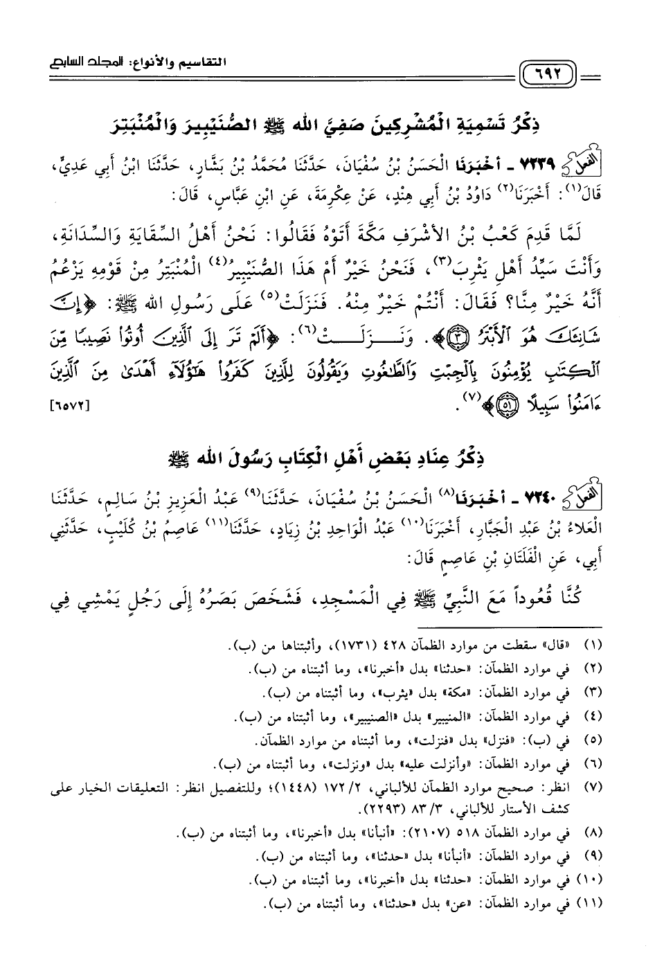 ٧٢٣٩ - أَخبَرنا الْحَسَنُ بْنُ سُفْيَانَ، حَدثنا مُحَمَّدُ بْنُ بَشَّارٍ، حَدثنا ابْنُ أَبِي عَدِيٍّ، قَالَ: أَخبَرنا دَاوُدُ بْنُ أَبِي هِنْدٍ، عَنْ عِكْرِمَةَ، عَنِ ابْنِ عَبَّاسٍ، قَالَ: لَمَّا قَدِمَ كَعْبُ بْنُ الأَشْرَفِ مَكَّةَ أَتَوْهُ، فَقَالُوا: نَحْنُ أَهْلُ السِّقَايَةِ وَالسِّدَانَةِ، وَأَنْتَ سَيِّدُ أَهْلِ يَثْرِبَ، فَنَحْنُ خَيْرٌ أَمْ هَذَا الصُّنَيْبِيرُ الْمُنْبَتِرُ مِنْ قَوْمِهِ يَزْعُمُ أَنَّهُ خَيْرٌ مِنَّا؟ فَقَالَ: أَنْتُمْ خَيْرٌ مِنْهُ، فَنَزَلَتْ عَلَى رَسُولِ اللهِ صَلى الله عَلَيه وسَلم: {إِنَّ شَانِئَكَ هُوَ الأَبْتَرُ}، وَنَزَلَتْ: {أَلَمْ تَرَ إِلَى الَّذِينَ أُوتُوا نَصِيبًا مِنَ الْكِتَابِ يُؤْمِنُونَ بِالْجِبْتِ وَالطَّاغُوتِ وَيَقُولُونَ لِلَّذِينَ كَفَرُوا هَؤُلَاءِ أَهْدَى مِنَ الَّذِينَ آمَنُوا سَبِيلاً}. [٦٥٧٢]
