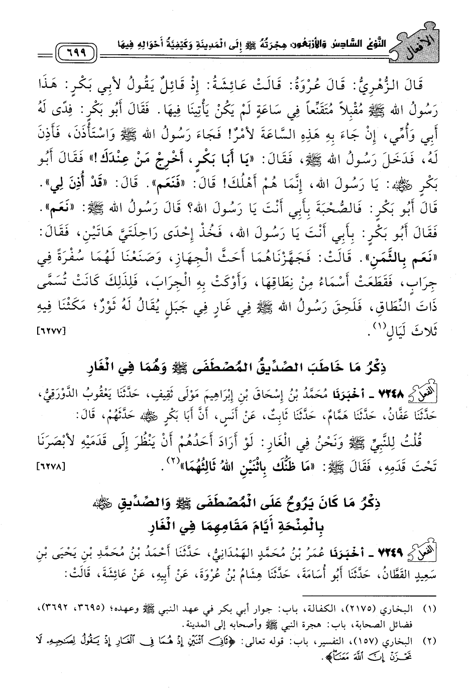 قَالَ الزُّهْرِيُّ: قَالَ عُرْوَةُ: قَالَتْ عَائِشَةُ: إِذْ قَائِلٌ يَقُولُ لأَبِي بَكْرٍ: هَذَا رَسُولُ اللهِ صَلى الله عَلَيه وسَلم مُقْبِلاً مُتَقَنِّعًا فِي سَاعَةٍ لَمْ يَكُنْ يَأْتِينَا فِيهَا، فَقَالَ أَبُو بَكْرٍ: فِدًى لَهُ أَبِي وَأُمِّي، إِنْ جَاءَ بِهِ هَذِهِ السَّاعَةَ لأَمْرٌ! فَجَاءَ رَسُولُ اللهِ صَلى الله عَلَيه وسَلم وَاسْتَأْذَنَ، فَأَذِنَ لَهُ، فَدَخَلَ رَسُولُ اللهِ صَلى الله عَلَيه وسَلم، فَقَالَ: "يَا أَبَا بَكْرٍ، أَخْرِجْ مَنْ عِنْدَكَ"، فَقَالَ أَبُو بَكْرٍ رَضِيَ اللهُ عَنْهُ: يَا رَسُولَ اللهِ، إِنَّمَا هُمْ أَهْلُكَ، قَالَ: "فَنَعَمْ"، قَالَ: "قَدْ أُذِنَ لِي"، قَالَ أَبُو بَكْرٍ: فَالصُّحْبَةَ بِأَبِي أَنْتَ يَا رَسُولَ اللهِ؟ قَالَ رَسُولُ اللهِ صَلى الله عَلَيه وسَلم: "نَعَمْ"، فَقَالَ أَبُو بَكْرٍ: بِأَبِي أَنْتَ يَا رَسُولَ اللهِ، فَخُذْ إِحْدَى رَاحِلَتَّيَ هَاتَيْنِ، فَقَالَ: "نَعَمْ بِالثَّمَنِ"، قَالَتْ: فَجَهَّزْنَاهُمَا أَحَثَّ الْجِهَازِ، وَصَنَعْنَا لَهُمَا سُفْرَةً فِي جِرَابٍ، فَقَطَعَتْ أَسْمَاءُ مِنْ نِطَاقِهَا، وَأَوْكَتْ بِهِ الْجِرَابَ، فَلِذَلِكَ كَانَتْ تُسَمَّى: ذَاتَ النِّطَاقِ، فَلَحِقَ رَسُولُ اللهِ صَلى الله عَلَيه وسَلم فِي غَارٍ فِي جَبَلٍ يُقَالُ لَهُ: ثَوْرٌ، مَكَثْنَا فِيهِ ثَلَاثَ لَيَالٍ. [٦٢٧٧]