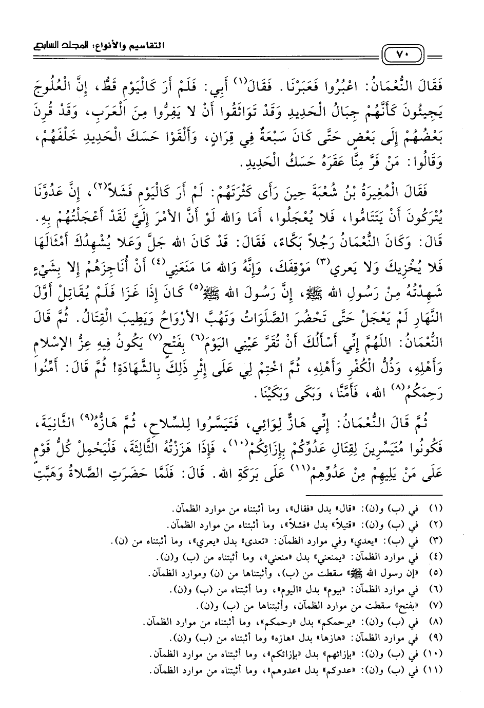 قَالَ: فَلَمَّا حَضَرَتِ الصَّلَاةُ وَهَبَّتِ الأَرْوَاحُ كَبَّرَ وَكَبَّرْنَا، وَقَالَ: رِيحُ الْفَتْحِ وَاللهِ إِنْ شَاءَ اللهُ، وَإِنِّي لأَرْجُو أَنْ يَسْتَجِيبَ اللهُ لِي وَأَنْ يَفْتَحَ عَلَيْنَا، فَهَزَّ اللِّوَاءَ فَتَيَسَّرُوا، ثُمَّ هَزَّهُ الثَّانِيَةَ، ثُمَّ هَزَّهُ الثَّالِثَةَ، فَحَمَلْنَا جَمِيعًا كُلُّ قَوْمٍ عَلَى مَنْ يَلِيهِمْ، وَقَالَ النُّعْمَانُ: إِنْ أَنَا أُصِبْتُ فَعَلَى النَّاسِ حُذَيْفَةُ بْنُ الْيَمَانِ، فَإِنْ أُصِيبَ حُذَيْفَةُ فَفُلَانٌ، فَإِنْ أُصِيبَ فُلَانٌ فَفُلَانٌ، حَتَّى عَدَّ سَبْعَةً آخِرُهُمُ الْمُغِيرَةُ بْنُ شُعْبَةَ، قَالَ أَبِي: فَوَاللهِ مَا عَلِمْتُ مِنَ الْمُسْلِمِينَ أَحَدًا يُحِبُّ أَنْ يَرْجِعَ إِلَى أَهْلِهِ حَتَّى يُقْتَلَ أَوْ يَظْفِرَ، وَثَبَتُوا لَنَا فَلَمْ نَسْمَعْ إِلَاّ وَقْعَ الْحَدِيدِ عَلَى الْحَدِيدِ حَتَّى أُصِيبَ فِي الْمُسْلِمِينَ مُصَابَةً عَظِيمَةً، فَلَمَّا رَأَوْا صَبْرَنَا وَرَأَوْنَا لَا نُرِيدُ أَنْ نَرْجِعَ، انْهَزَمُوا، فَجَعَلَ يَقَعُ الرَّجُلُ فَيَقَعُ عَلَيْهِ سَبْعَةٌ فِي قِرَانٍ فَيُقْتَلُونَ جَمِيعًا، وَجَعَلَ يَعْقِرُهُمْ حَسَكُ الْحَدِيدِ خَلْفَهُمْ. فَقَالَ النُّعْمَانُ: قَدِّمُوا اللِّوَاءَ! فَجَعَلْنَا نُقَدِّمُ اللِّوَاءَ فَنَقْتُلُهُمْ وَنَهْزِمُهُمْ، فَلَمَّا رَأَى النُّعْمَانُ أَنَّ اللهَ قَدِ اسْتَجَابَ لَهُ وَرَأَى الْفَتْحَ جَاءَتْهُ نُشَّابَةٌ، فَأَصَابَتْ خَاصِرَتَهُ فَقَتَلَتْهُ،