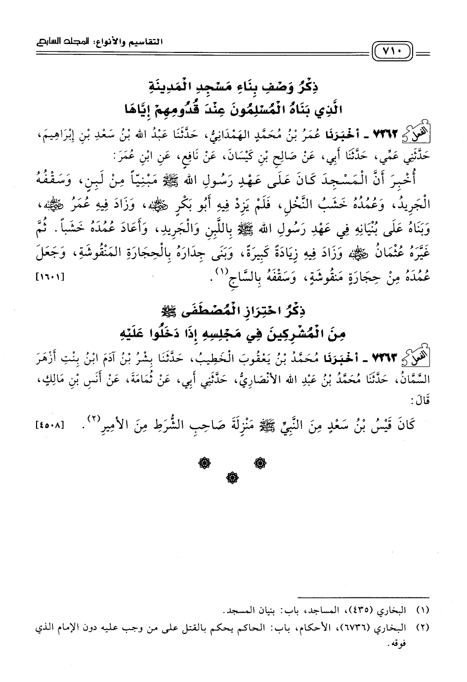 ٧٢٦٢ - أَخبَرنا عُمَرُ بْنُ مُحَمَّدٍ الْهَمْدَانِيُّ، حَدثنا عَبْدُ اللهِ بْنُ سَعْدِ بْنِ إِبْرَاهِيمَ، حَدَّثَنِي عَمِّي، حَدثنا أَبِي، عَنْ صَالِحِ بْنِ كَيْسَانَ، عَنْ نَافِعٍ، عَنِ ابْنِ عُمَرَ: أُخْبِرَ أَنَّ الْمَسْجِدَ كَانَ عَلَى عَهْدِ رَسُولِ اللهِ صَلى الله عَلَيه وسَلم مَبْنِيًّا مِنْ لَبِنٍ، وَسَقْفُهُ الْجَرِيدُ، وَعُمُدُهُ خَشَبُ النَّخْلِ، فَلَمْ يَزِدْ فِيهِ أَبُو بَكْرٍ رَضِيَ اللهُ عَنْهُ، وَزَادَ فِيهِ عُمَرُ رَضِيَ اللهُ عَنْهُ، وَبَنَاهُ عَلَى بُنْيَانِهِ فِي عَهْدِ رَسُولِ اللهِ صَلى الله عَلَيه وسَلم بِاللَّبِنِ وَالْجَرِيدِ، وَأَعَادَ عُمُدَهُ خَشَبًا، ثُمَّ غَيَّرَهُ عُثْمَانُ رَضِيَ اللهُ عَنْهُ، وَزَادَ فِيهِ زِيَادَةً كَبِيرَةً، وَبَنَى جِدَارَهُ بِالْحِجَارَةِ الْمَنْقُوشَةِ، وَجَعَلَ عُمُدَهُ مِنْ حِجَارَةٍ مَنْقُوشَةٍ، وَسَقَّفَهُ بِالسَّاجِ. [١٦٠١]