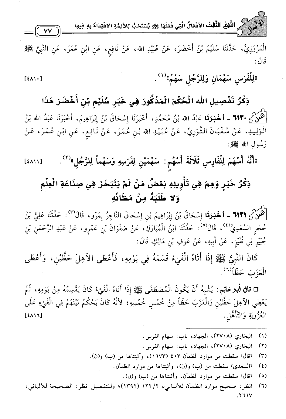 ٦١٣٠ - أَخبَرنا عَبْدُ اللهِ بْنُ مُحَمَّدٍ، أَخبَرنا إِسْحَاقُ بْنُ إِبْرَاهِيمَ، أَخبَرنا عَبْدُ اللهِ بْنُ الْوَلِيدِ، عَنْ سُفْيَانَ الثَّوْرِيِّ، عَنْ عُبَيْدِ اللهِ بْنِ عُمَرَ، عَنْ نَافِعٍ، عَنِ ابْنِ عُمَرَ، عَنْ رَسُولِ اللهِ صَلى الله عَلَيه وسَلم، أَنَّهُ أَسْهَمَ لِلْفَارِسِ ثَلَاثَةَ أَسْهُمٍ، سَهْمَيْنِ لِفَرَسِهِ، وَسَهْمًا لِلرَّجُلِ. [٤٨١١]