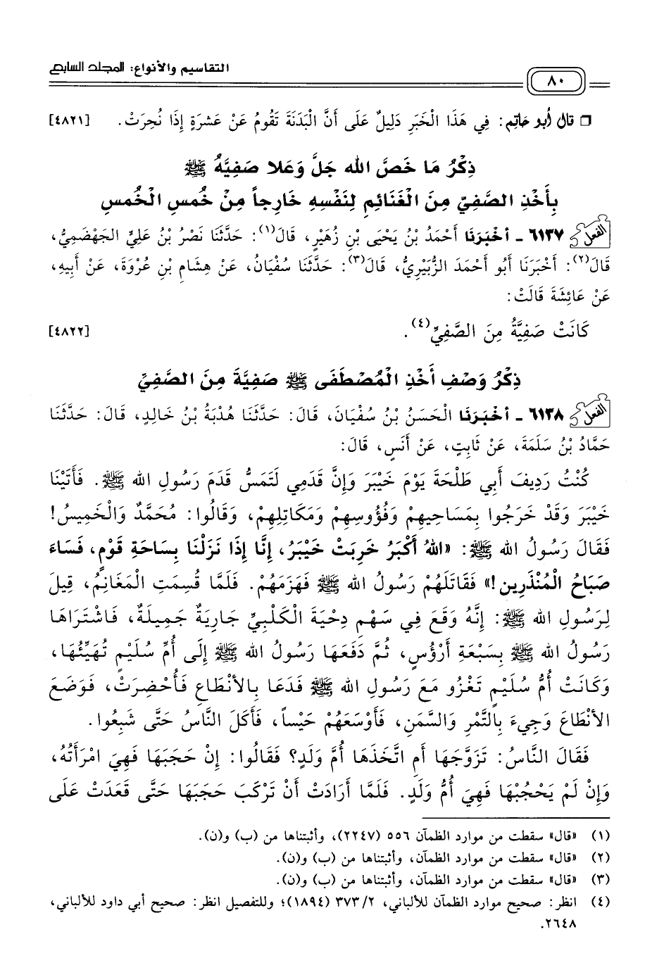 ذِكْرُ وَصْفِ أَخْذِ الْمُصْطَفَى صَلى الله عَلَيه وسَلم صَفِيَّةَ مِنَ الصَّفِيِّ.