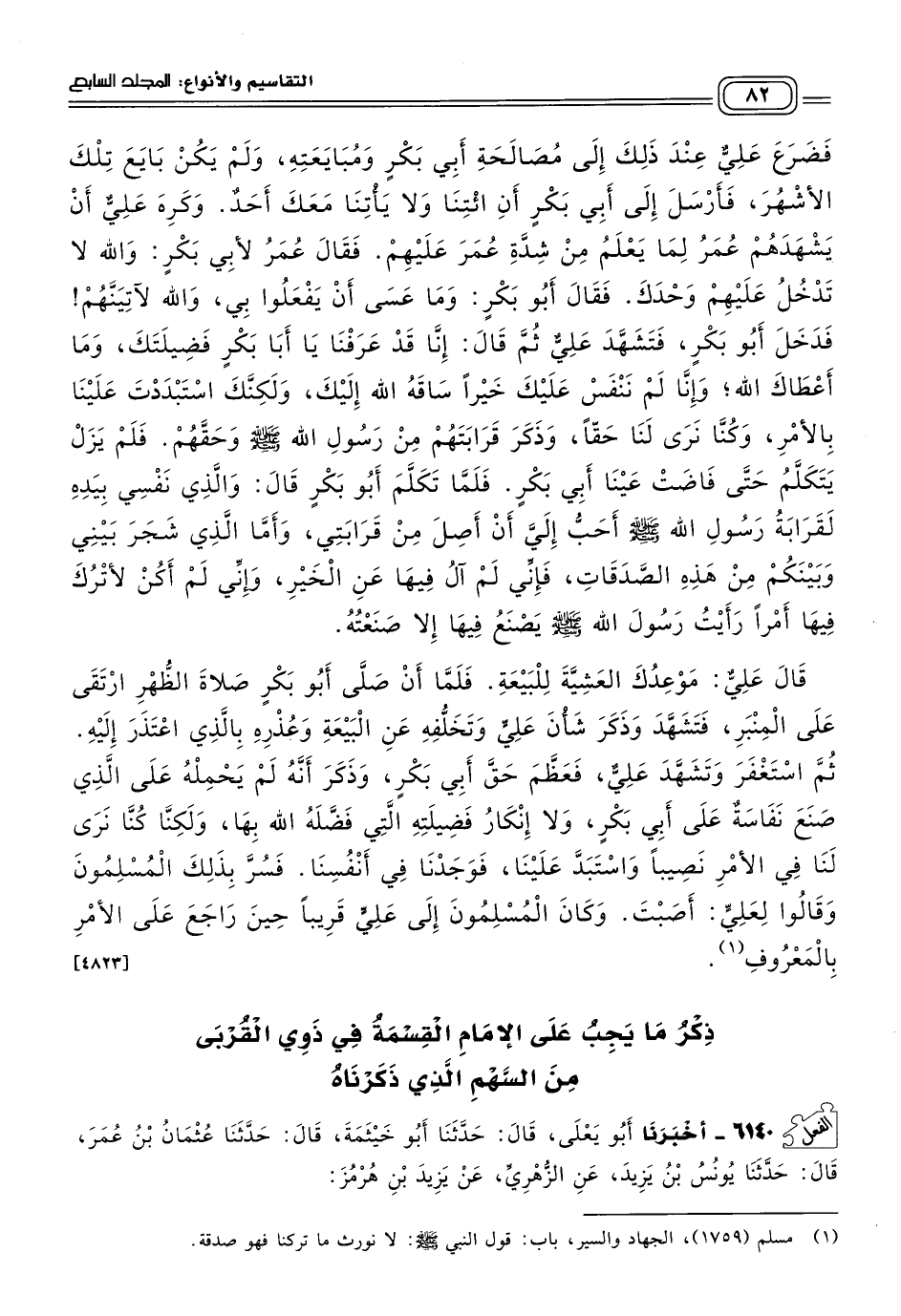 وَإِنَّا لَمْ نَنْفَسْ عَلَيْكَ خَيْرًا سَاقَهُ اللهُ إِلَيْكَ، وَلَكِنَّكَ اسْتَبْدَدْتَ عَلَيْنَا بِالأَمْرِ، وَكُنَّا نَرَى لَنَا حَقًّا، وَذَكَرَ قَرَابَتَهُمْ مِنْ رَسُولِ اللهِ صَلى الله عَلَيه وسَلم وَحَقَّهُمْ، فَلَمْ يَزَلْ يَتَكَلَّمُ حَتَّى فَاضَتْ عَيْنَا أَبِي بَكْرٍ، فَلَمَّا تَكَلَّمَ أَبُو بَكْرٍ قَالَ: وَالَّذِي نَفْسِي بِيَدِهِ لَقَرَابَةُ رَسُولِ اللهِ صَلى الله عَلَيه وسَلم أَحَبُّ إِلَيَّ أَنْ أَصِلَ مِنْ قَرَابَتِي، وَأَمَّا الَّذِي شَجَرَ بَيْنِي وَبَيْنَكُمْ مِنْ هَذِهِ الصَّدَقَاتِ، فَإِنِّي لَمْ آلُ فِيهَا عَنِ الْخَيْرِ، وَإِنِّي لَمْ أَكُنْ لأَتْرُكَ فِيهَا أَمْرًا رَأَيْتُ رَسُولَ اللهِ صَلى الله عَلَيه وسَلم يَصْنَعُ فِيهَا إِلَاّ صَنَعْتُهُ.
