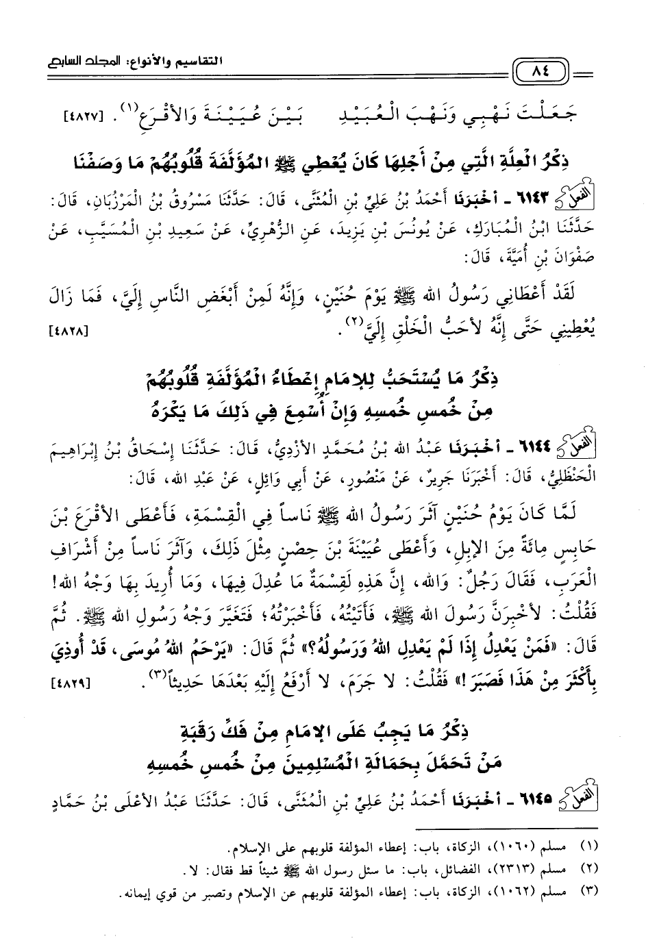 ٦١٤٣ - أَخبَرنا أَحْمَدُ بْنُ عَلِيِّ بْنِ الْمُثَنَّى، قَالَ: حَدثنا مَسْرُوقُ بْنُ الْمَرْزُبَانِ، قَالَ: حَدثنا ابْنُ الْمُبَارَكِ، عَنْ يُونُسَ بْنِ يَزِيدَ، عَنِ الزُّهْرِيِّ، عَنْ سَعِيدِ بْنِ الْمُسَيَّبِ، عَنْ صَفْوَانَ بْنِ أُمَيَّةَ، قَالَ: لَقَدْ أَعْطَانِي رَسُولُ اللهِ صَلى الله عَلَيه وسَلم يَوْمَ حُنَيْنٍ، وَإِنَّهُ لَمِنْ أَبْغَضِ النَّاسِ إِلَيَّ، فَمَا زَالَ يُعْطِينِي حَتَّى إِنَّهُ لأَحَبُّ الْخَلْقِ إِلَيَّ. [٤٨٢٨]