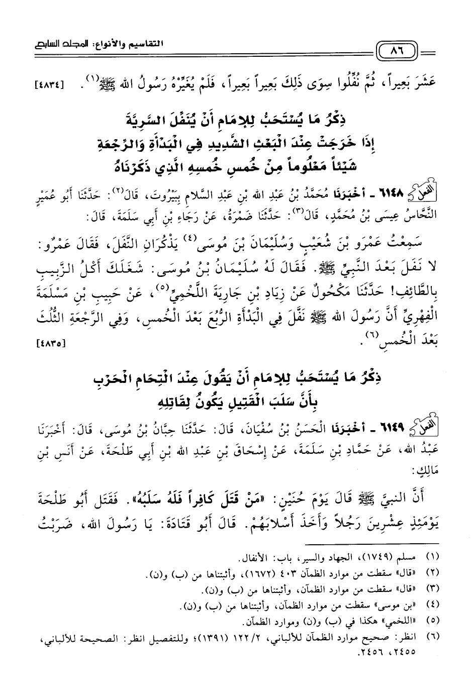 ٦١٤٨ - أَخبَرنا مُحَمَّدُ بْنُ عَبْدِ اللهِ بْنِ عَبْدِ السَّلَامِ، بِبَيْرُوتَ، قَالَ: حَدثنا أَبُو عُمَيْرٍ النَّحَّاسُ عِيسَى بْنُ مُحَمَّدٍ، قَالَ: حَدثنا ضَمْرَةُ، عَنْ رَجَاءِ بْنِ أَبِي سَلَمَةَ، قَالَ: سَمِعْتُ عَمْرَو بْنَ شُعَيْبٍ وَسُلَيْمَانَ بْنَ مُوسَى يَذْكُرَانِ النَّفَلَ، فَقَالَ عَمْرٌو: لَا نَفَلَ بَعْدَ النَّبِيِّ صَلى الله عَلَيه وسَلم، فَقَالَ لَهُ سُلَيْمَانُ بْنُ مُوسَى: شَغَلَكَ أَكْلُ الزَّبِيبِ بِالطَّائِفِ! حَدثنا مَكْحُولٌ، عَنْ زِيَادِ بْنِ جَارِيَةَ اللَّخْمِيِّ، عَنْ حَبِيبِ بْنِ مَسْلَمَةَ الْفِهْرِيِّ، أَنَّ رَسُولَ اللهِ صَلى الله عَلَيه وسَلم نَفَّلَ فِي الْبَدْأَةِ الرُّبُعَ بَعْدَ الْخُمُسِ، وَفِي الرَّجْعَةِ الثُّلُثَ بَعْدَ الْخُمُسِ. [٤٨٣٥]