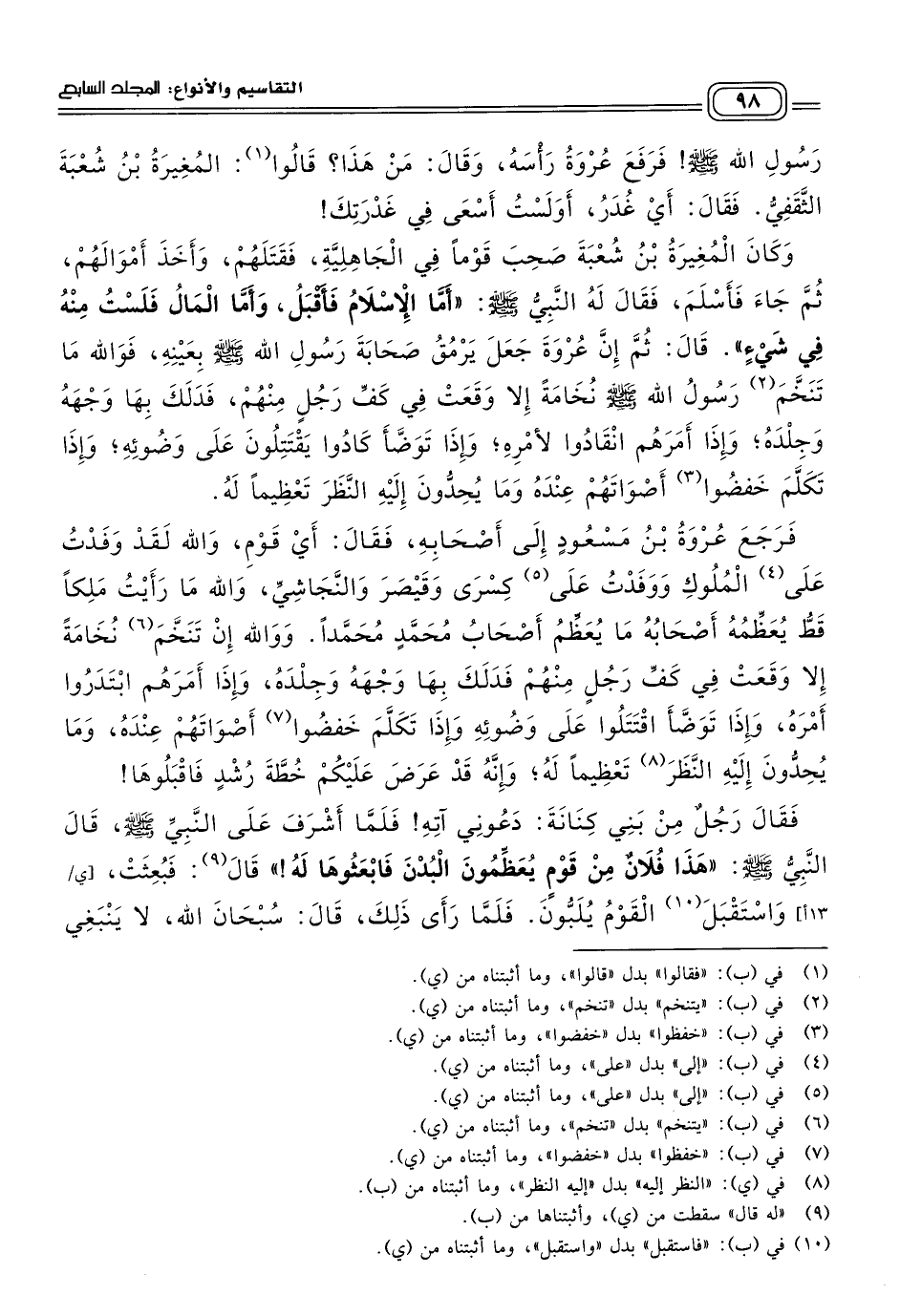 فَرَجَعَ عُرْوَةُ بْنُ مَسْعُودٍ إِلَى أَصْحَابِهِ، فَقَالَ: أَيْ قَوْمِ، وَاللهِ لَقَدْ وَفَدْتُ عَلَى الْمُلُوكِ وَوَفَدْتُ عَلَى كِسْرَى وَقَيْصَرَ وَالنَّجَاشِيِّ، وَاللهِ مَا رَأَيْتُ مَلِكًا قَطُّ يُعَظِّمُهُ أَصْحَابُهُ مَا يُعَظِّمُ أَصْحَابُ مُحَمَّدٍ مُحَمَّدًا، وَوَاللهِ إِنْ تَنَخَّمَ نُخَامَةً إِلَاّ وَقَعَتْ فِي كَفِّ رَجُلٍ مِنْهُمْ فَدَلَكَ بِهَا وَجْهَهُ وَجِلْدَهُ، وَإِذَا أَمَرَهُمُ ابْتَدَرُوا أَمْرَهُ، وَإِذَا تَوَضَّأَ اقْتَتَلُوا عَلَى وَضُوئِهِ وَإِذْ تَكَلَّمَ خَفَضُوا أَصْوَاتَهُمْ عِنْدَهُ، وَمَا يُحِدُّونَ إِلَيْهِ النَّظَرَ تَعْظِيمًا لَهُ، وَإِنَّهُ قَدْ عَرَضَ عَلَيْكُمْ خُطَّةَ رُشْدٍ فَاقْبَلَوهَا! فَقَالَ رَجُلٌ مِنْ بَنِي كِنَانَةَ: دَعُونِي آتِهِ، فَلَمَّا أَشْرَفَ عَلَى النَّبِيِّ صَلى الله عَلَيه وسَلم، قَالَ النَّبِيُّ صَلى الله عَلَيه وسَلم: "هَذَا فُلَانٌ مِنْ قَوْمٍ يُعَظِّمُونَ الْبُدْنَ فَابْعَثُوهَا لَهُ"، قَالَ: فَبُعِثَتْ، وَاسْتَقْبَلَ الْقَوْمُ يُلَبُّونَ، فَلَمَّا رَأَى ذَلِكَ، قَالَ: سُبْحَانَ اللهِ، لَا يَنْبَغِي لِهَؤُلَاءِ أَنْ يُصَدُّوا عَنِ الْبَيْتِ، فَلَمَّا رَجَعَ إِلَى أَصْحَابِهِ، قَالَ: رَأَيْتُ الْبُدْنَ قَدْ قُلِّدَتْ وَأُشْعِرَتْ، فَمَا أَرَى أَنْ يُصَدُّوا عَنِ الْبَيْتِ، فَقَامَ رَجُلٌ مِنْهُمْ يُقَالُ لَهُ مِكْرَزٌ، فَقَالَ: دَعُونِي آتِهِ،