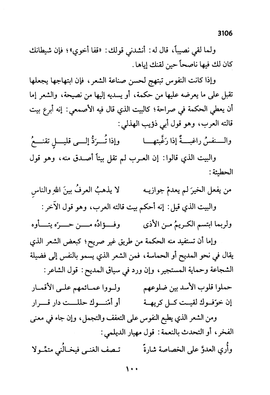 وإذا كانت النفوس تبتهج لحسن صناعة الشعر، فإن ابتهاجها يجعلها تقبل على ما يعرضه عليها من حكمة، أو يسديه إليها من نصيحة، والشعر إما أن يعطي الحكمة في صراحة؛ كالبيت الذي قال فيه الأصمعي: إنه أبرع بيت قالته العرب، وهو قول أبي ذؤيب الهذلي: