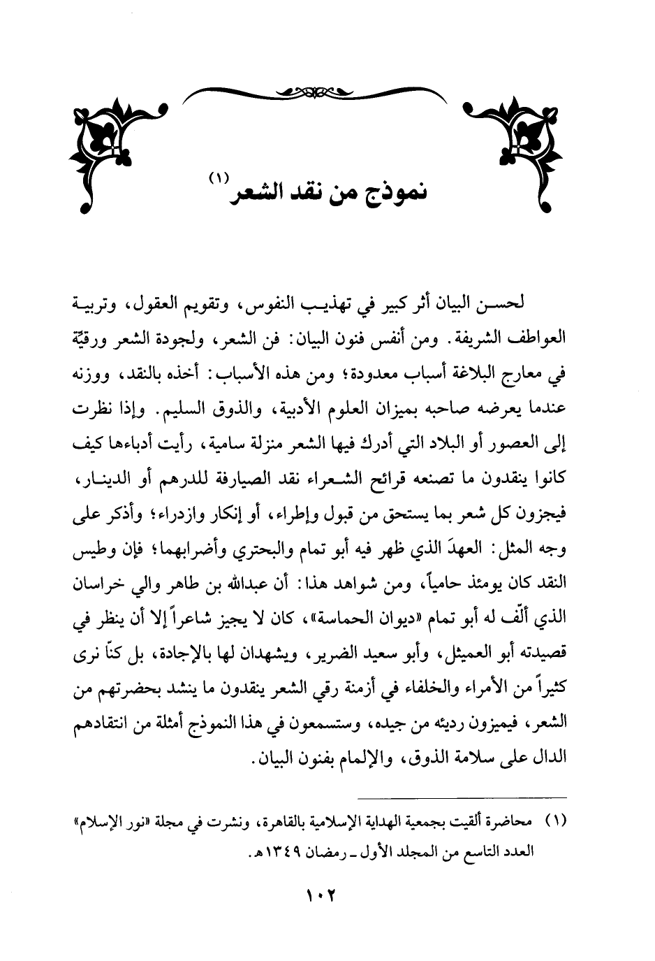 لحسن البيان أثر كبير في تهذيب النفوس، وتقويم العقول، وتربية العواطف الشريفة. ومن أنفس فنون البيان: فن الشعر، ولجودة الشعر ورقيَّة في معارج البلاغة أسباب معدودة؛ ومن هذه الأسباب: أخذه بالنقد، ووزنه عندما يعرضه صاحبه بميزان العلوم الأدبية، والذوق السليم. وإذا نظرت إلى العصور أو البلاد التي أدرك فيها الشعر منزلة سامية، رأيت أدباءها كيف كانوا ينقدون ما تصنعه قرائح الشعراء نقد الصيارفة للدرهم أو الدينار، فيجزون كل شعر بما يستحق من قبول وإطراء، أو إنكار وازدراء؛ وأذكر على وجه المثل: العهدَ الذي ظهر فيه أبو تمام والبحتري وأضرابهما؛ فإن وطيس النقد كان يومئذ حاميًا، ومن شواهد هذا: أن عبد الله بن طاهر والي خراسان الذي ألّف له أبو تمام "ديوان الحماسة"، كان لا يجيز شاعرًا إلا أن ينظر في قصيدته أبو العميثل، وأبو سعيد الضرير، ويشهدان لها بالإجادة، بل كنّا نرى كثيراً من الأمراء والخلفاء في أزمنة رقي الشعر ينقدون ما ينشد بحضرتهم من الشعر، فيميزون رديئه من جيده، وستسمعون في هذا النموذج أمثلة من انتقادهم الدال على سلامة الذوق، والإلمام بفنون البيان.