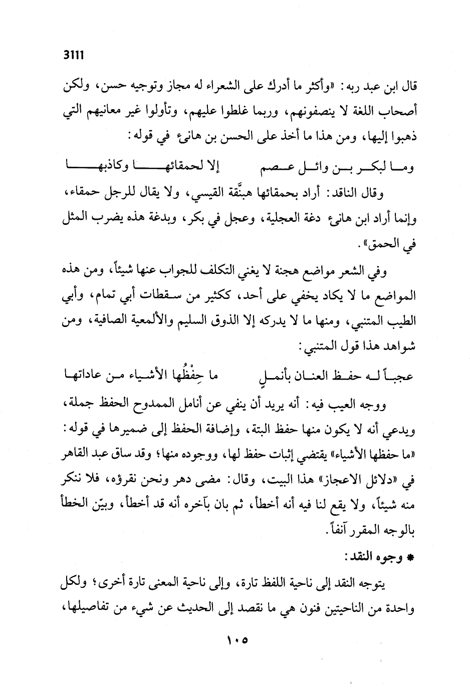 ووجه العيب فيه: أنه يريد أن ينفي عن أنامل الممدوح الحفظ جملة، ويدعي أنه لا يكون منها حفظ البتة، وإضافة الحفظ إلى ضميرها في قوله: "ما حفظها الأشياء" يقتضي إثبات حفظ لها، ووجوده منها؛ وقد ساق عبد القاهر في "دلائل الاعجاز" هذا البيت، وقال: مضى دهر ونحن نقرؤه، فلا ننكر منه شيئاً، ولا يقع لنا فيه أنه أخطأ، ثم بأن بآخره أنه قد أخطأ، وبيّن الخطأ بالوجه المقرر آنفاً.