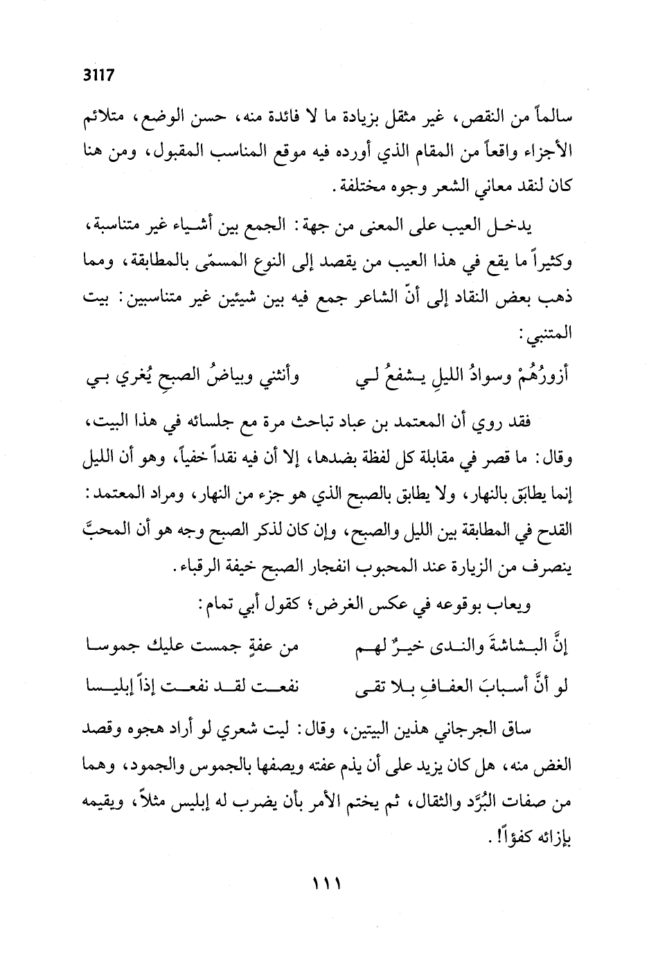 ساق الجرجاني هذين البيتين، وقال: ليت شعري لو أراد هجوه وقصد الغض منه، هل كان يزيد على أن يذم عفته ويصفها بالجموس والجمود، وهما من صفات البُرَّد والثقال، ثم يختم الأمر بأن يضرب له إبليس مثلاً، ويقيمه بإزائه كفؤاً!.