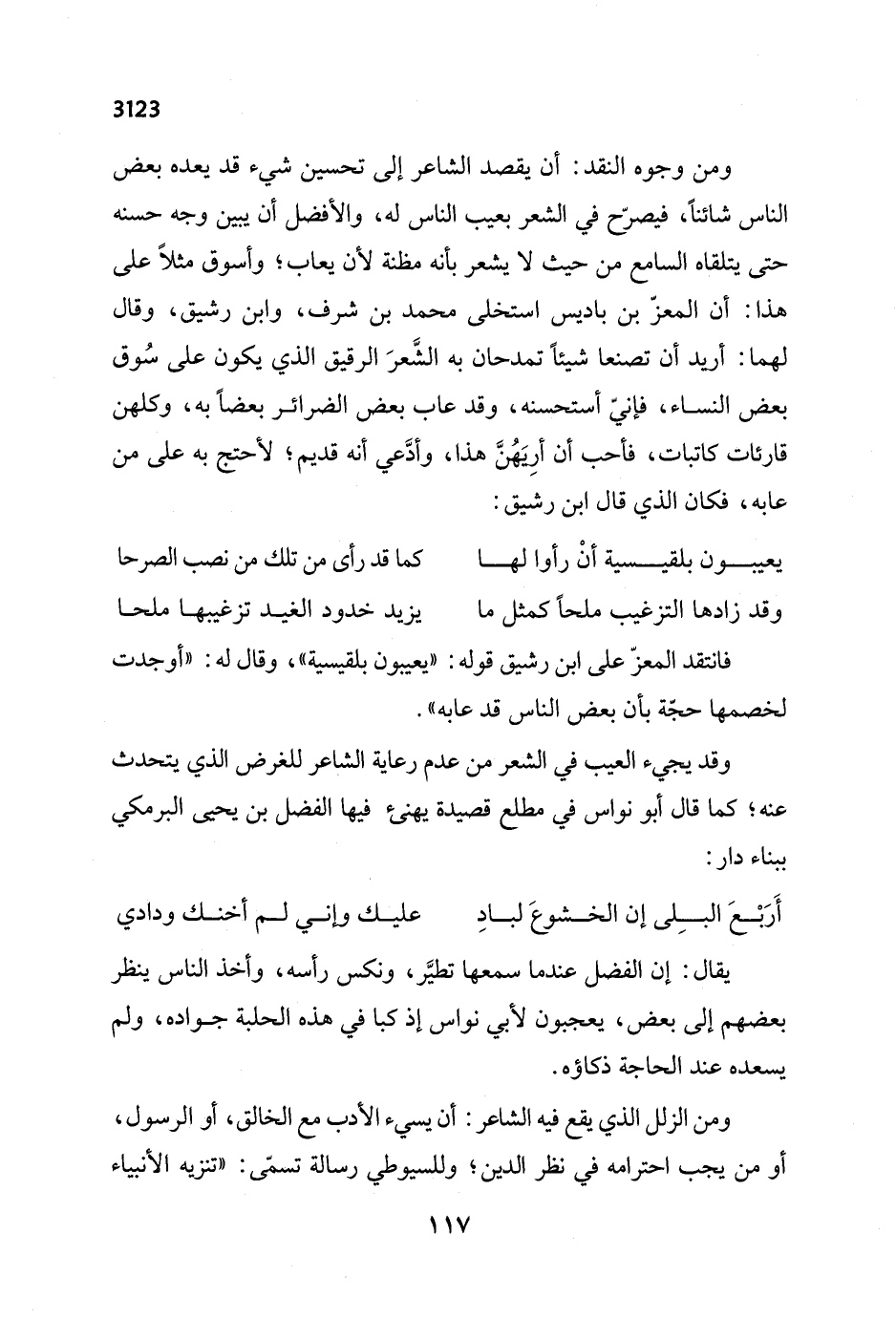 ومن وجوه النقد: أن يقصد الشاعر إلى تحسين شيء قد يعده بعض الناس شائنًا، فيصرّح في الشعر بعيب الناس له، والأفضل أن يبين وجه حسنه حتى يتلقاه السامع من حيث لا يشعر بأنه مظنة لأن يعاب؛ وأسوق مثلاً على هذا: أن المعزّ بن باديس استخلى محمد بن شرف، وابن رشيق، وقال لهما: أريد أن تصنعا شيئاً تمدحان به الشَّعرَ الرقيق الذي يكون على سُوق بعض النساء، فإنيّ أستحسنه، وقد عاب بعض الضرائر بعضاً به، وكلهن قارئات كاتبات، فأحب أن أرِيهُنَّ هذا، وأدَّعي أنه قديم؛ لأحتج به على من عابه، فكان الذي قال ابن رشيق: