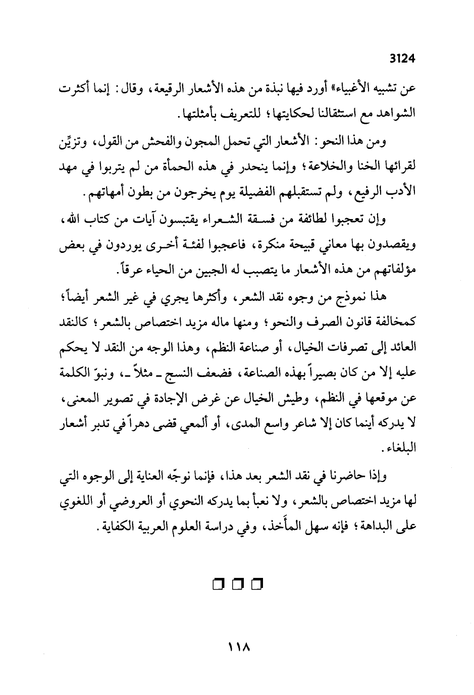 وإذا حاضرنا في نقد الشعر بعد هذا، فإنما نوجّه العناية إلى الوجوه التي لها مزيد اختصاص بالشعر، ولا نعبأ بما يدركه النحوي أو العروضي أو اللغوي على البداهة؛ فإنه سهل المأَخذ، وفي دراسة العلوم العربية الكفاية.