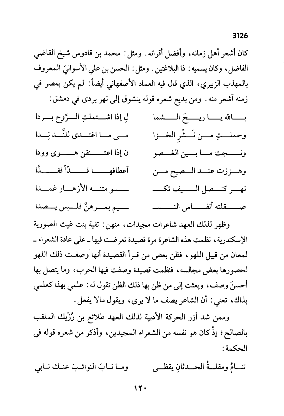 وممن شد أزر الحركة الأدبية لذلك العهد طلائع بن رُزّيك الملقب بالصالح؛ إذْ كان هو نفسه من الشعراء المجيدين، وأذكر من شعره قوله في الحكمة: