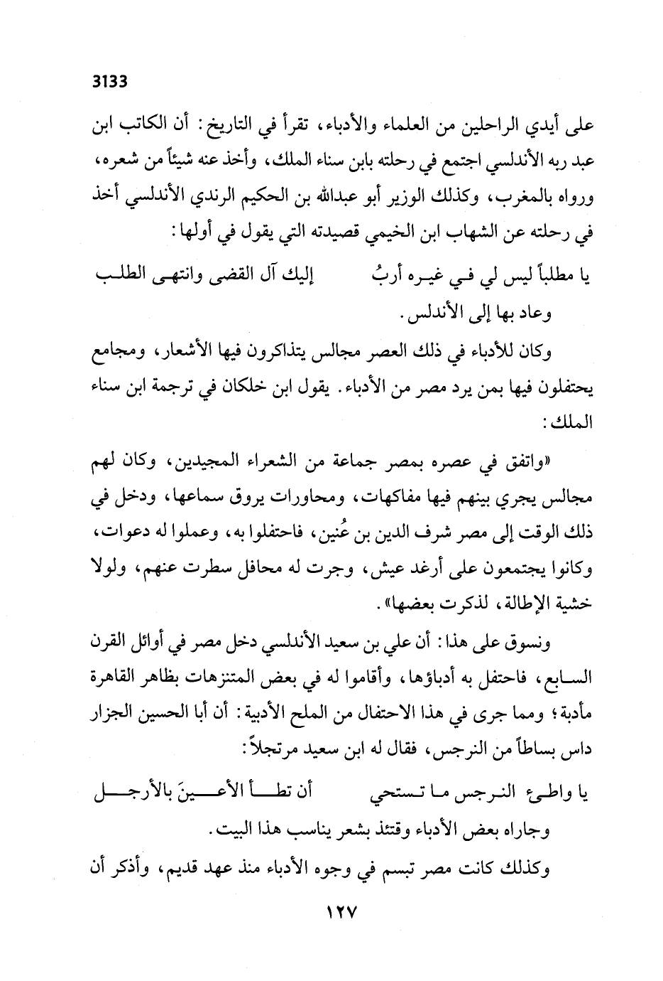 ونسوق على هذا: أن علي بن سعيد الأندلسي دخل مصر في أوائل القرن السابع، فاحتفل به أدباؤها، وأقاموا له في بعض المتنزهات بظاهر القاهرة مأدبة؛ ومما جرى في هذا الاحتفال من الملح الأدبية: أن أبا الحسين الجزار داس بساطاً من النرجس، فقال له ابن سعيد مرتجلاً: