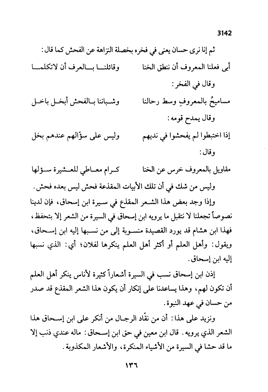 وإذا وجد بعض هذا الشعر المقذع في سيرة ابن إسحاق، فإن لدينا نصوصًا تجعلنا لا نتقبل ما يرويه ابن إسحاق في السيرة من الشعر إلا بتحفظ، فهذا ابن هشام قد يورد القصيدة منسوبة إلى من نسبها إليه ابن إسحاق، ويقول: وأهل العلم أو أكثر أهل العلم ينكرها لفلان؛ أي: الذي نسبها إليه ابن إسحاق.