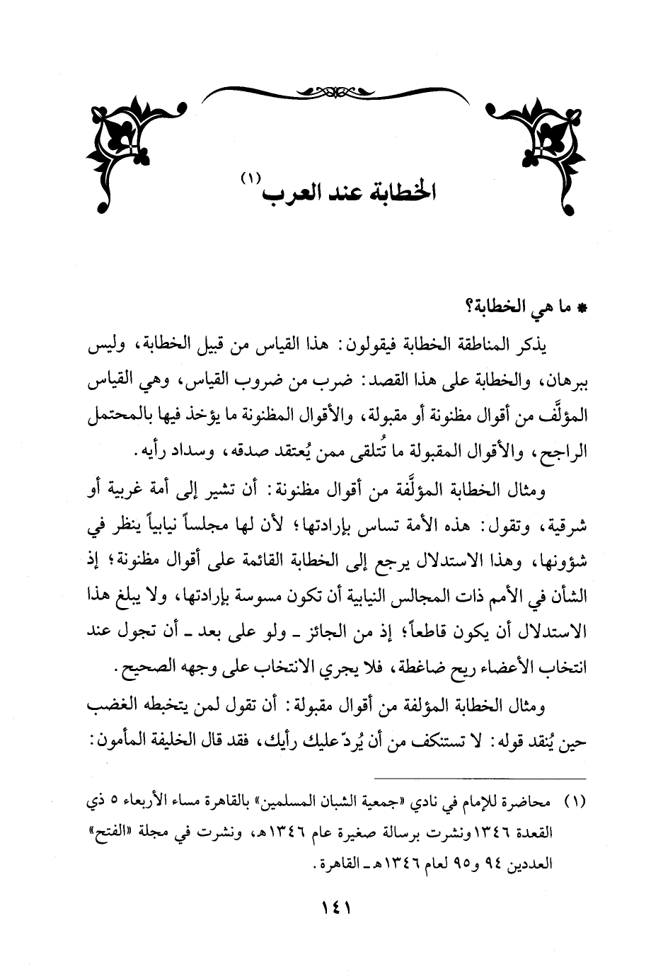 (¬1) محاضرة للإمام في نادي "جمعية الشبان المسلمين" بالقاهرة مساء الأربعاء 5 ذي القعدة 1346 ونشرت برسالة صغيرة عام 1346 هـ، ونشرت في مجلة "الفتح" العددين 94 و 95 لعام 1346 هـ - القاهرة.