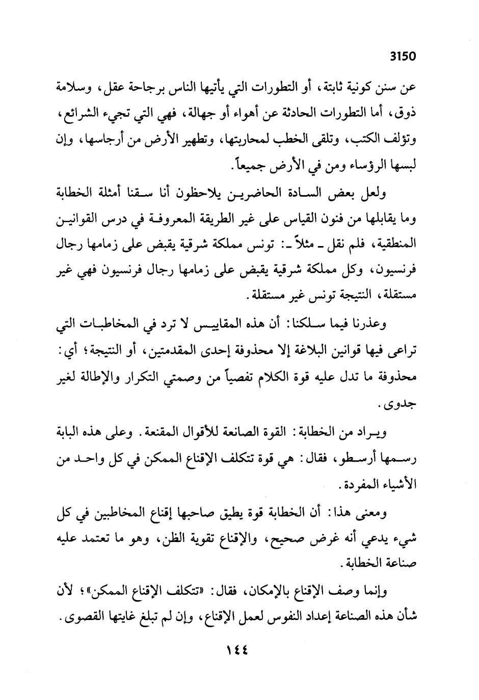ولعل بعض السادة الحاضرين يلاحظون أنا سقنا أمثلة الخطابة وما يقابلها من فنون القياس على غير الطريقة المعروفة في درس القوانين المنطقية، فلم نقل - مثلاً -: تونس مملكة شرقية يقبض على زمامها رجال فرنسيون، وكل مملكة شرقية يقبض على زمامها رجال فرنسيون فهي غير مستقلة، النتيجة تونس غير مستقلة.