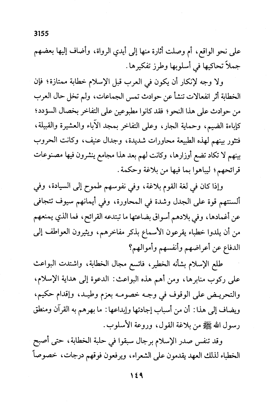 ولا وجه لإنكار أن يكون في العرب قبل الإسلام خطابة ممتازة؛ فإن الخطابة أثر انفعالات تنشأ عن حوادث تمس الجماعات، ولم تخل حال العرب من حوادث على هذا النحو؛ فقد كانوا مطبوعين على التفاخر بخصال السؤدد؛ كإباءة الضيم، وحماية الجار، وعلى التفاخر بمجد الآباء والعشيرة والقبيلة، فتثور بينهم لهذه الطبيعة محاورات شديدة، وجدال عنيف، وكانت الحروب بينهم لا تكاد تضع أوزارها، وكانت لهم بعد هذا مجامع ينشرون فيها مصنوعات قرائحهم؛ ليباهوا بما فيها من بلاغة وحكمة.
